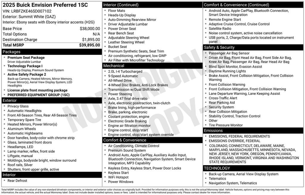 Summit White 2025 Buick Envision Preferred AWD 9-Speed Automatic 2.0L Turbocharged 3.47 Final Drive Axle Ratio, 30 Diagonal LCD Display, 4-Wheel Disc Brakes, 9 Speakers, ABS brakes, Air Conditioning, Alloy wheels, AM/FM radio: SiriusXM, Auto High-beam Headlights, Auto-dimming door mirrors, Auto-dimming Rear-View mirror, Automatic temperature control, Bose Premium 9-Speaker Audio System Feature, Brake assist, Bumpers: body-color, Compass, Delay-off headlights, Driver 4-Way Power Lumbar Seat Adjuster, Driver 8-Way Power Seat Adjuster, Driver door bin, Driver vanity mirror, Dual front impact airbags, Dual front side impact airbags, Electronic Stability Control, Emergency communication system: OnStar and Buick connected services capable, Exterior Parking Camera Rear, Four wheel independent suspension, Front anti-roll bar, Front Bucket Seats, Front Center Armrest, Front Passenger 6-Way Manual Seat Adjuster, Front reading lights, Fully automatic headlights, Heads-Up Display, Heated door mirrors, Illuminated entry, Knee airbag, Leather steering wheel, Low tire pressure warning, Memory seat, Navigation System, Occupant sensing airbag, Outside temperature display, Overhead airbag, Overhead console, Panic alarm, Passenger door bin, Passenger vanity mirror, Perforated Leatherette Seat Trim, Power door mirrors, Power driver seat, Power Liftgate, Power steering, Power windows, Preferred Equipment Group 1SC, Premium audio system: Buick Infotainment System, Radio data system, Radio: Infotainment Center, Rear anti-roll bar, Rear reading lights, Rear seat center armrest, Rear window defroster, Rear window wiper, Remote keyless entry, Security system, SiriusXM Trial Subscription, Speed control, Split folding rear seat, Spoiler, Steering wheel mounted audio controls, Telescoping steering wheel, Tilt steering wheel, Traction control, Trip computer, Variably intermittent wipers, Wheels: 18 Alloy w/Technical Gray, Wireless Apple CarPlay/Wireless Android Auto.Keep it Simple with Sims Simple Steps to your next vehicle! Pick your car, configure your deal, and schedule delivery! We make it simple. Need more pictures? Just ask! Would a walk around video help? No problem! Thank you for letting Sims keep it Simple for you! 22/28 City/Highway MPG Price includes: $500 - Bonus Cash. Exp. 12/01/2025