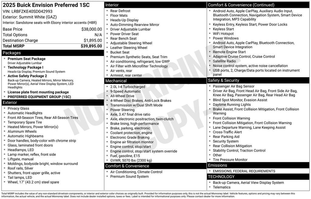 Summit White 2025 Buick Envision Preferred AWD 9-Speed Automatic 2.0L Turbocharged 3.47 Final Drive Axle Ratio, 30 Diagonal LCD Display, 4-Wheel Disc Brakes, 9 Speakers, ABS brakes, Air Conditioning, Alloy wheels, AM/FM radio: SiriusXM, Auto High-beam Headlights, Auto-dimming door mirrors, Auto-dimming Rear-View mirror, Automatic temperature control, Bose Premium 9-Speaker Audio System Feature, Brake assist, Bumpers: body-color, Compass, Delay-off headlights, Driver 4-Way Power Lumbar Seat Adjuster, Driver 8-Way Power Seat Adjuster, Driver door bin, Driver vanity mirror, Dual front impact airbags, Dual front side impact airbags, Electronic Stability Control, Emergency communication system: OnStar and Buick connected services capable, Exterior Parking Camera Rear, Four wheel independent suspension, Front anti-roll bar, Front Bucket Seats, Front Center Armrest, Front Passenger 6-Way Manual Seat Adjuster, Front reading lights, Fully automatic headlights, Heads-Up Display, Heated door mirrors, Illuminated entry, Knee airbag, Leather steering wheel, Low tire pressure warning, Memory seat, Navigation System, Occupant sensing airbag, Outside temperature display, Overhead airbag, Overhead console, Panic alarm, Passenger door bin, Passenger vanity mirror, Perforated Leatherette Seat Trim, Power door mirrors, Power driver seat, Power Liftgate, Power steering, Power windows, Preferred Equipment Group 1SC, Premium audio system: Buick Infotainment System, Radio data system, Radio: Infotainment Center, Rear anti-roll bar, Rear reading lights, Rear seat center armrest, Rear window defroster, Rear window wiper, Remote keyless entry, Security system, SiriusXM Trial Subscription, Speed control, Split folding rear seat, Spoiler, Steering wheel mounted audio controls, Telescoping steering wheel, Tilt steering wheel, Traction control, Trip computer, Variably intermittent wipers, Wheels: 18 Alloy w/Technical Gray, Wireless Apple CarPlay/Wireless Android Auto.
