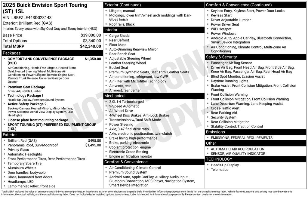 Brilliant Red 2025 Buick Envision Sport Touring AWD 9-Speed Automatic 2.0L Turbocharged 3-Channel Programmable Universal Home Remote, 3.47 Final Drive Axle Ratio, 30 Diagonal LCD Display, 4-Wheel Disc Brakes, 9 Speakers, ABS brakes, Air Conditioning, Air Quality Indicator Sensor, Alloy wheels, AM/FM radio: SiriusXM, Auto High-beam Headlights, Auto-dimming door mirrors, Auto-dimming Rear-View mirror, Automatic Air Recirculation, Automatic temperature control, Bose Premium 9-Speaker Audio System Feature, Brake assist, Bumpers: body-color, Comfort & Convenience Package, Compass, Delay-off headlights, Driver 4-Way Power Lumbar Seat Adjuster, Driver 8-Way Power Seat Adjuster, Driver door bin, Driver vanity mirror, Dual front impact airbags, Dual front side impact airbags, Dual-Zone Auto Climate Control Air Conditioning, Electronic Stability Control, Emergency communication system: OnStar and Buick connected services capable, Exterior Parking Camera Rear, Four wheel independent suspension, Front anti-roll bar, Front Bucket Seats, Front Center Armrest, Front Passenger 6-Way Manual Seat Adjuster, Front reading lights, Fully automatic headlights, Hands-Free Power Programmable Liftgate, Heads-Up Display, Heated door mirrors, Heated Driver & Front Passenger Seats, Heated Steering Wheel, Illuminated entry, Knee airbag, Leather steering wheel, Low tire pressure warning, Memory seat, Navigation System, Occupant sensing airbag, Outside temperature display, Overhead airbag, Overhead console, Panic alarm, Passenger door bin, Passenger vanity mirror, Perforated Leather-Appointed Seat Trim, Power door mirrors, Power driver seat, Power Liftgate, Power Panoramic Tilt-Sliding Moonroof, Power steering, Power windows, Preferred Equipment Group 1SL, Premium audio system: Buick Infotainment System, Radio data system, Radio: Infotainment Center, Rear anti-roll bar, Rear reading lights, Rear seat center armrest, Rear window defroster, Rear window wiper, Remote keyless entry, Security system, SiriusXM Trial Subscription, Speed control, Split folding rear seat, Spoiler, Sport steering wheel, Steering wheel mounted audio controls, Telescoping steering wheel, Tilt steering wheel, Traction control, Trip computer, Variably intermittent wipers, Wheels: 20 Carbon Flash Metallic Alloy, Wireless Apple CarPlay/Wireless Android Auto.