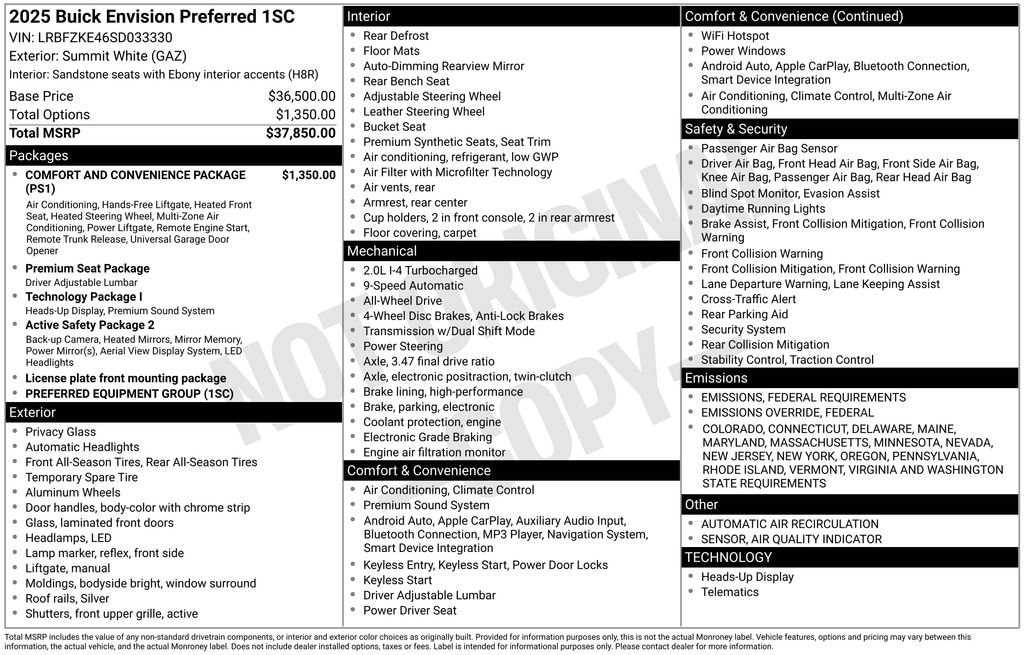 Summit White 2025 Buick Envision Preferred AWD 9-Speed Automatic 2.0L Turbocharged 3-Channel Programmable Universal Home Remote, 3.47 Final Drive Axle Ratio, 30 Diagonal LCD Display, 4-Wheel Disc Brakes, 9 Speakers, ABS brakes, Air Conditioning, Air Quality Indicator Sensor, Alloy wheels, AM/FM radio: SiriusXM, Auto High-beam Headlights, Auto-dimming door mirrors, Auto-dimming Rear-View mirror, Automatic Air Recirculation, Automatic temperature control, Bose Premium 9-Speaker Audio System Feature, Brake assist, Bumpers: body-color, Comfort & Convenience Package, Compass, Delay-off headlights, Driver 4-Way Power Lumbar Seat Adjuster, Driver 8-Way Power Seat Adjuster, Driver door bin, Driver vanity mirror, Dual front impact airbags, Dual front side impact airbags, Dual-Zone Auto Climate Control Air Conditioning, Electronic Stability Control, Emergency communication system: OnStar and Buick connected services capable, Exterior Parking Camera Rear, Four wheel independent suspension, Front anti-roll bar, Front Bucket Seats, Front Center Armrest, Front Passenger 6-Way Manual Seat Adjuster, Front reading lights, Fully automatic headlights, Hands-Free Power Programmable Liftgate, Heads-Up Display, Heated door mirrors, Heated Driver & Front Passenger Seats, Heated Steering Wheel, Illuminated entry, Knee airbag, Leather steering wheel, Low tire pressure warning, Memory seat, Navigation System, Occupant sensing airbag, Outside temperature display, Overhead airbag, Overhead console, Panic alarm, Passenger door bin, Passenger vanity mirror, Perforated Leatherette Seat Trim, Power door mirrors, Power driver seat, Power Liftgate, Power steering, Power windows, Preferred Equipment Group 1SC, Premium audio system: Buick Infotainment System, Radio data system, Radio: Infotainment Center, Rear anti-roll bar, Rear reading lights, Rear seat center armrest, Rear window defroster, Rear window wiper, Remote keyless entry, Security system, SiriusXM Trial Subscription, Speed control, Split folding rear seat, Spoiler, Steering wheel mounted audio controls, Telescoping steering wheel, Tilt steering wheel, Traction control, Trip computer, Variably intermittent wipers, Wheels: 18 Alloy w/Technical Gray, Wireless Apple CarPlay/Wireless Android Auto.