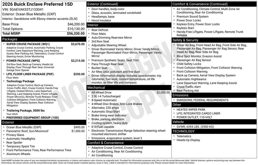 Ocean Blue Metallic 2026 Buick Enclave Preferred AWD 8-Speed Automatic 2.5L DOHC AWD, 110-Volt Power Outlet, 12 Speakers, 1st & 2nd Row All-Weather Floor Liners (LPO), 2nd Row 1-Touch Flat Folding Seat, 3 Years OnStar One, 3rd Row 60/40 Power Split-Folding Bench, 3rd Row All-Weather Floor Liner (LPO), 3rd row seats: split-bench, 4-Wheel Disc Brakes, ABS brakes, Air Conditioning, Alloy wheels, AM/FM radio: SiriusXM with 360L, Apple CarPlay/Android Auto, Auto High-beam Headlights, Auto-dimming door mirrors, Auto-dimming Rear-View mirror, Automatic temperature control, Bose Premium 12-Speaker Audio System, Brake assist, Bumpers: body-color, Compass, Delay-off headlights, Driver 4-Way Power Lumbar Seat Adjuster, Driver 8-Way Power Seat Adjuster, Driver Attention Assist, Driver door bin, Driver vanity mirror, Dual front impact airbags, Dual front side impact airbags, Electronic Stability Control, Emergency communication system: OnStar and Buick connected services capable, Enhanced Automatic Parking Assist, Floor Liner Package (LPO), Four wheel independent suspension, Front anti-roll bar, Front Bucket Seats, Front Center Armrest, Front dual zone A/C, Front Passenger 4-Way Power Lumbar Seat Adjuster, Front Passenger 6-Way Power Seat Adjuster, Front reading lights, Fully automatic headlights, Head-Up Display, Heated door mirrors, Heated Driver & Front Passenger Seats, Heated front seats, Heated steering wheel, Heated Wiper Park, Illuminated entry, Inside Rearview Auto-Dimming Rear Camera Mirror, Integrated Cargo Liner (LPO), Leather steering wheel, Leatherette Seat Trim, Low tire pressure warning, Memory Settings, Navigation System, Occupant sensing airbag, Outside temperature display, Overhead airbag, Overhead console, Panic alarm, Passenger door bin, Passenger vanity mirror, Power door mirrors, Power driver seat, Power Liftgate, Power Package, Power Panoramic Sunroof w/Sunshade, Power passenger seat, Power steering, Power windows, Preferred Equipment Group 1SD, Premium audio system: Buick Infotainment System, Radio data system, Radio: Infotainment Center, Rear air conditioning, Rear anti-roll bar, Rear reading lights, Rear side impact airbag, Rear window defroster, Rear window wiper, Remote keyless entry, Security system, SiriusXM w/360L Trial Subscription, Speed control, Speed-sensing steering, Spoiler, Steering wheel mounted audio controls, Super Cruise, Super Cruise Package, Tachometer, Telescoping steering wheel, Tilt steering wheel, Traction control, Trip computer, Turn signal indicator mirrors, Universal Home Remote, Variably intermittent wipers, Voltmeter, Wheels: 20 Alloy w/Medium Android Finish, Wireless Apple CarPlay, Wireless Google Android Auto, AWD.