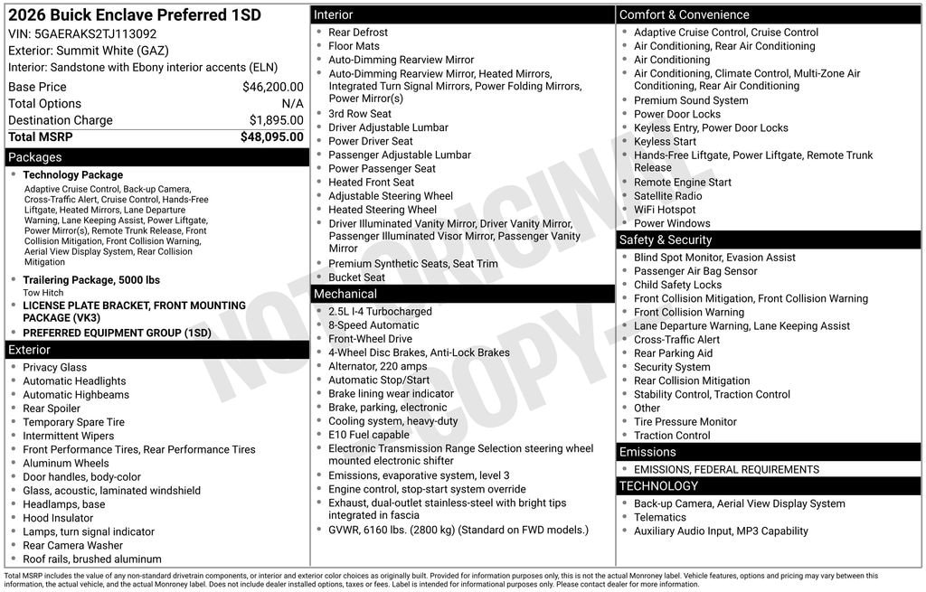 Summit White 2026 Buick Enclave Preferred FWD 8-Speed Automatic 2.5L DOHC FWD, 12 Speakers, 3rd row seats: split-bench, 4-Wheel Disc Brakes, ABS brakes, Air Conditioning, Alloy wheels, AM/FM radio: SiriusXM with 360L, Apple CarPlay/Android Auto, Auto High-beam Headlights, Auto-dimming door mirrors, Auto-dimming Rear-View mirror, Automatic temperature control, Bose Premium 12-Speaker Audio System, Brake assist, Bumpers: body-color, Compass, Delay-off headlights, Driver 4-Way Power Lumbar Seat Adjuster, Driver 8-Way Power Seat Adjuster, Driver door bin, Driver vanity mirror, Dual front impact airbags, Dual front side impact airbags, Electronic Stability Control, Emergency communication system: OnStar and Buick connected services capable, Four wheel independent suspension, Front anti-roll bar, Front Bucket Seats, Front Center Armrest, Front dual zone A/C, Front Mounting License Plate Bracket Package, Front Passenger 4-Way Power Lumbar Seat Adjuster, Front Passenger 6-Way Power Seat Adjuster, Front reading lights, Fully automatic headlights, Heated door mirrors, Heated Driver & Front Passenger Seats, Heated front seats, Heated steering wheel, Illuminated entry, Leather steering wheel, Leatherette Seat Trim, Low tire pressure warning, Navigation System, Occupant sensing airbag, Outside temperature display, Overhead airbag, Overhead console, Panic alarm, Passenger door bin, Passenger vanity mirror, Power door mirrors, Power driver seat, Power Liftgate, Power passenger seat, Power steering, Power windows, Preferred Equipment Group 1SD, Premium audio system: Buick Infotainment System, Radio data system, Radio: Infotainment Center, Rear air conditioning, Rear anti-roll bar, Rear reading lights, Rear side impact airbag, Rear window defroster, Rear window wiper, Remote keyless entry, Security system, SiriusXM w/360L Trial Subscription, Speed control, Speed-sensing steering, Spoiler, Steering wheel mounted audio controls, Tachometer, Telescoping steering wheel, Tilt steering wheel, Traction control, Trip computer, Turn signal indicator mirrors, Variably intermittent wipers, Voltmeter, Wheels: 20 Alloy w/Medium Android Finish, Wireless Apple CarPlay, Wireless Google Android Auto, FWD.