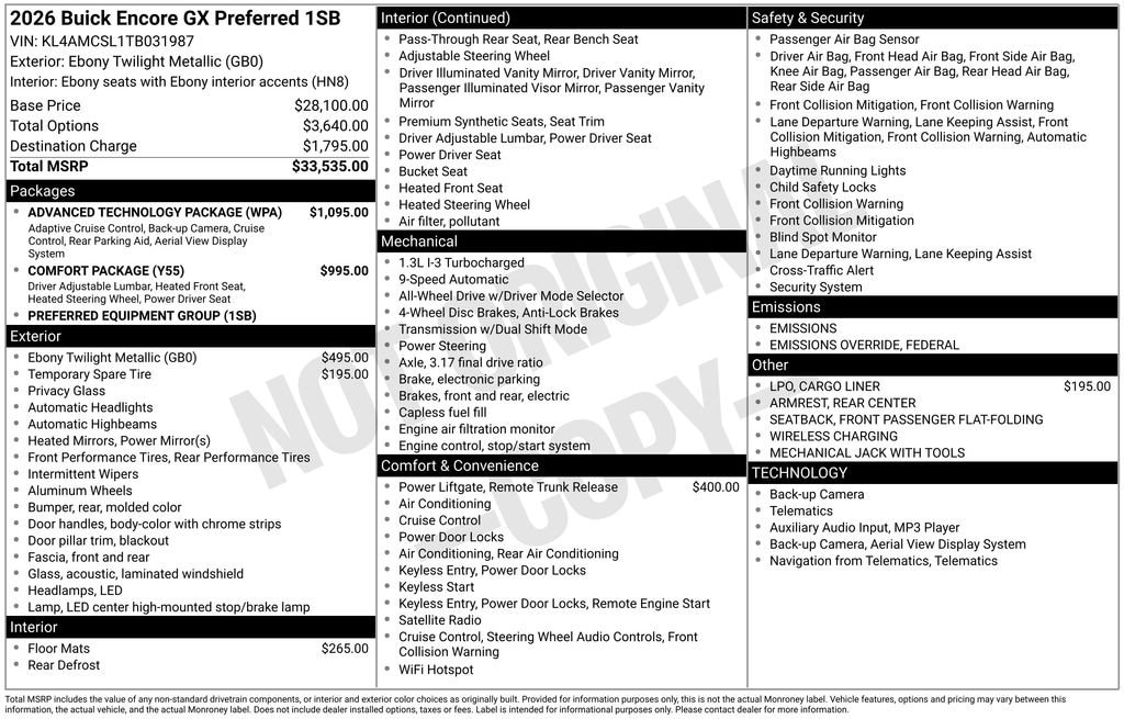 Ebony Twilight Metallic 2026 Buick Encore GX Preferred AWD 9-Speed Automatic ECOTEC 1.3L Turbo 2-Way Power Driver Lumbar Control, 3.17 Final Drive Axle Ratio, 4-Way Manual Passenger Seat Adjuster, 4-Wheel Disc Brakes, 6-Way Manual Driver Seat Adjuster, 7 Speakers, 8-Way Power Driver Seat Adjuster, ABS brakes, Adaptive Cruise Control, Advanced Technology Package, Air Conditioning, All-Weather Floor Liners (LPO), Alloy wheels, AM/FM radio: SiriusXM, Auto High-beam Headlights, Automatic temperature control, Brake assist, Bumpers: body-color, Cargo Liner (LPO), Cloth w/Leatherette Seat Trim, Comfort Package, Compass, Delay-off headlights, Driver door bin, Driver vanity mirror, Dual front impact airbags, Dual front side impact airbags, Electronic Stability Control, Emergency communication system: OnStar and Buick connected services capable, Enhanced Performance 7-Speaker System w/Amplifier, Flat-Folding Front Passenger Seatback, Front anti-roll bar, Front Bucket Seats, Front Center Armrest, Front reading lights, Front wheel independent suspension, Fully automatic headlights, HD Surround Vision, Heated door mirrors, Heated Driver & Front Passenger Seats, Heated Steering Wheel, Illuminated entry, Knee airbag, Low tire pressure warning, Mechanical Jack w/Tools, Occupant sensing airbag, Outside temperature display, Overhead airbag, Overhead console, Panic alarm, Passenger door bin, Passenger vanity mirror, Power door mirrors, Power Liftgate, Power steering, Power windows, Preferred Equipment Group 1SB, Radio data system, Radio: AM/FM Audio System, Rear Center Armrest, Rear Park Assist, Rear reading lights, Rear side impact airbag, Rear window defroster, Rear window wiper, Remote keyless entry, Ride & Handling Suspension, Security system, SiriusXM Trial Subscription, Speed control, Speed-sensing steering, Split folding rear seat, Spoiler, Steering wheel mounted audio controls, Tachometer, Telescoping steering wheel, Tilt steering wheel, Traction control, Trip computer, Variably intermittent wipers, Wheels: 18 Bright Silver Painted Aluminum, Wireless Apple CarPlay/Wireless Android Auto, Wireless Charging.