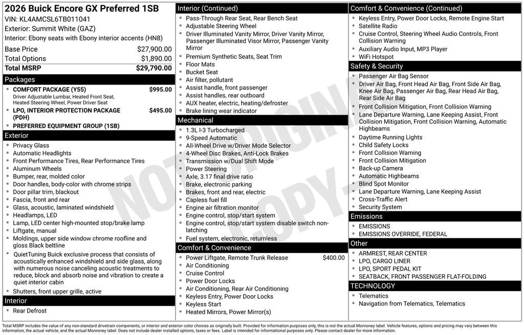 Summit White 2026 Buick Encore GX Preferred AWD 9-Speed Automatic ECOTEC 1.3L Turbo 2-Way Power Driver Lumbar Control, 3.17 Final Drive Axle Ratio, 4-Way Manual Passenger Seat Adjuster, 4-Wheel Disc Brakes, 6-Way Manual Driver Seat Adjuster, 7 Speakers, 8-Way Power Driver Seat Adjuster, ABS brakes, Air Conditioning, All-Weather Floor Liners (LPO), Alloy wheels, AM/FM radio: SiriusXM, Auto High-beam Headlights, Automatic temperature control, Brake assist, Bumpers: body-color, Cargo Liner (LPO), Cloth w/Leatherette Seat Trim, Comfort Package, Compass, Delay-off headlights, Driver door bin, Driver vanity mirror, Dual front impact airbags, Dual front side impact airbags, Electronic Stability Control, Emergency communication system: OnStar and Buick connected services capable, Enhanced Performance 7-Speaker System w/Amplifier, Flat-Folding Front Passenger Seatback, Front anti-roll bar, Front Bucket Seats, Front Center Armrest, Front reading lights, Front wheel independent suspension, Fully automatic headlights, Heated door mirrors, Heated Driver & Front Passenger Seats, Heated Steering Wheel, Illuminated entry, Interior Protection Package (LPO), Knee airbag, Low tire pressure warning, Occupant sensing airbag, Outside temperature display, Overhead airbag, Overhead console, Panic alarm, Passenger door bin, Passenger vanity mirror, Power door mirrors, Power Liftgate, Power steering, Power windows, Preferred Equipment Group 1SB, Radio data system, Radio: AM/FM Audio System, Rear Center Armrest, Rear reading lights, Rear side impact airbag, Rear window defroster, Rear window wiper, Remote keyless entry, Ride & Handling Suspension, Security system, SiriusXM Trial Subscription, Speed control, Speed-sensing steering, Split folding rear seat, Spoiler, Sport Pedal Kit (LPO), Steering wheel mounted audio controls, Tachometer, Telescoping steering wheel, Tilt steering wheel, Traction control, Trip computer, Variably intermittent wipers, Wheels: 18 Bright Silver Painted Aluminum, Wireless Apple CarPlay/Wireless Android Auto.