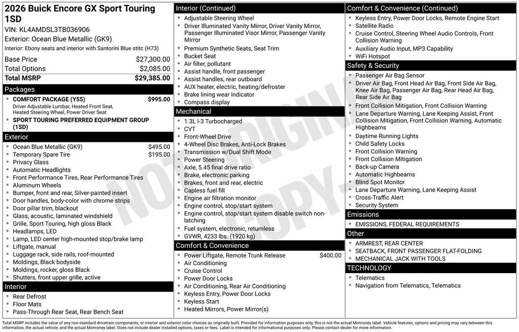 Ocean Blue Metallic 2026 Buick Encore GX Sport Touring FWD CVT ECOTEC 1.3L Turbo 2-Way Power Driver Lumbar Control, 4-Way Manual Passenger Seat Adjuster, 4-Wheel Disc Brakes, 5.45 Final Drive Axle Ratio, 6 Speakers, 6-Way Manual Driver Seat Adjuster, 8-Way Power Driver Seat Adjuster, ABS brakes, Air Conditioning, Alloy wheels, AM/FM radio: SiriusXM, Auto High-beam Headlights, Automatic temperature control, Brake assist, Bumpers: body-color, Comfort Package, Compass, Delay-off headlights, Driver door bin, Driver vanity mirror, Dual front impact airbags, Dual front side impact airbags, Electronic Stability Control, Emergency communication system: OnStar and Buick connected services capable, Enhanced Performance 6-Speaker System, Flat-Folding Front Passenger Seatback, Front anti-roll bar, Front Bucket Seats, Front Center Armrest, Front reading lights, Front wheel independent suspension, Fully automatic headlights, Heated door mirrors, Heated Driver & Front Passenger Seats, Heated Steering Wheel, Illuminated entry, Knee airbag, Leatherette Seat Trim, Low tire pressure warning, Mechanical Jack w/Tools, Occupant sensing airbag, Outside temperature display, Overhead airbag, Overhead console, Panic alarm, Passenger door bin, Passenger vanity mirror, Power door mirrors, Power Liftgate, Power steering, Power windows, Preferred Equipment Group 1SD, Radio data system, Radio: AM/FM Audio System, Rear Center Armrest, Rear reading lights, Rear side impact airbag, Rear window defroster, Rear window wiper, Remote keyless entry, Ride & Handling Suspension, Security system, SiriusXM Trial Subscription, Speed control, Speed-sensing steering, Split folding rear seat, Spoiler, Sport steering wheel, Steering wheel mounted audio controls, Tachometer, Telescoping steering wheel, Tilt steering wheel, Traction control, Trip computer, Variably intermittent wipers, Wheels: 18 Gloss Black Aluminum, Wireless Apple CarPlay/Wireless Android Auto.
