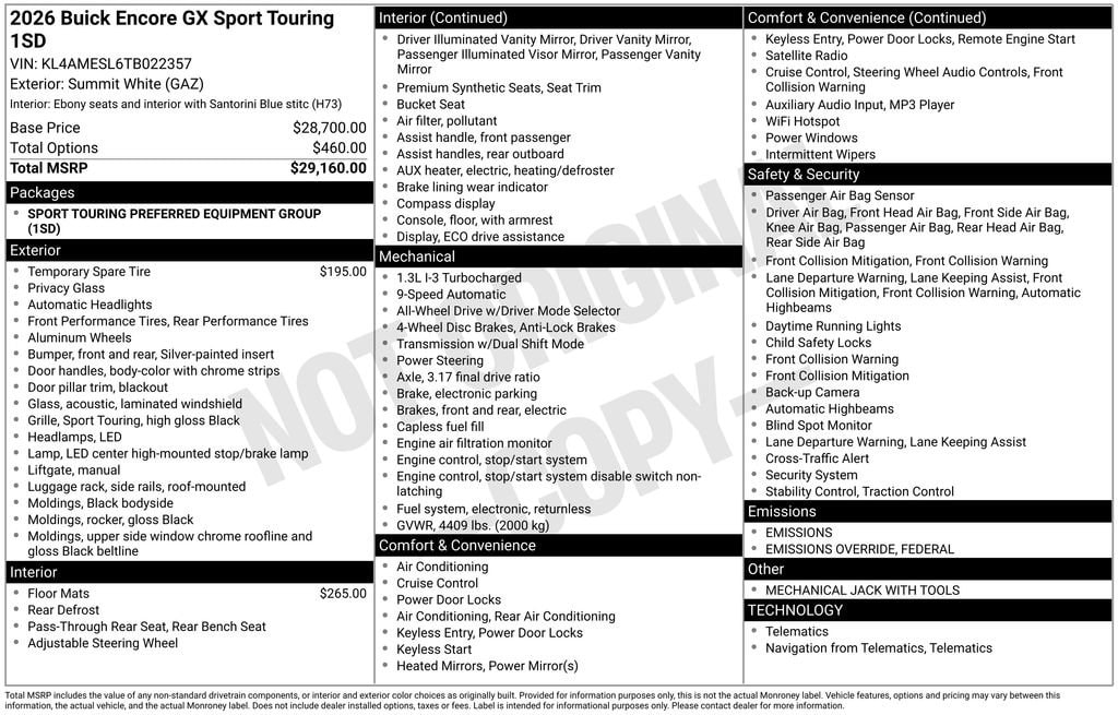 Summit White 2026 Buick Encore GX Sport Touring AWD 9-Speed Automatic ECOTEC 1.3L Turbo 3.17 Final Drive Axle Ratio, 4-Way Manual Passenger Seat Adjuster, 4-Wheel Disc Brakes, 6-Way Manual Driver Seat Adjuster, 7 Speakers, ABS brakes, Air Conditioning, All-Weather Floor Liners (LPO), Alloy wheels, AM/FM radio: SiriusXM, Auto High-beam Headlights, Automatic temperature control, Brake assist, Bumpers: body-color, Compass, Delay-off headlights, Driver door bin, Driver vanity mirror, Dual front impact airbags, Dual front side impact airbags, Electronic Stability Control, Emergency communication system: OnStar and Buick connected services capable, Enhanced Performance 7-Speaker System w/Amplifier, Front anti-roll bar, Front Bucket Seats, Front Center Armrest, Front reading lights, Front wheel independent suspension, Fully automatic headlights, Heated door mirrors, Illuminated entry, Knee airbag, Leatherette Seat Trim, Low tire pressure warning, Mechanical Jack w/Tools, Occupant sensing airbag, Outside temperature display, Overhead airbag, Overhead console, Panic alarm, Passenger door bin, Passenger vanity mirror, Power door mirrors, Power steering, Power windows, Preferred Equipment Group 1SD, Radio data system, Radio: AM/FM Audio System, Rear reading lights, Rear side impact airbag, Rear window defroster, Rear window wiper, Remote keyless entry, Ride & Handling Suspension, Security system, SiriusXM Trial Subscription, Speed control, Speed-sensing steering, Split folding rear seat, Spoiler, Sport steering wheel, Steering wheel mounted audio controls, Tachometer, Telescoping steering wheel, Tilt steering wheel, Traction control, Trip computer, Variably intermittent wipers, Wheels: 18 Gloss Black Aluminum, Wireless Apple CarPlay/Wireless Android Auto.