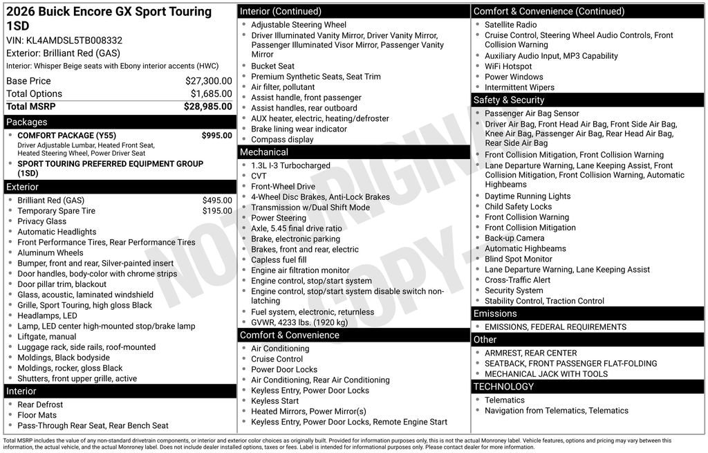 Brilliant Red 2026 Buick Encore GX Sport Touring FWD CVT ECOTEC 1.3L Turbo 2-Way Power Driver Lumbar Control, 4-Way Manual Passenger Seat Adjuster, 4-Wheel Disc Brakes, 5.45 Final Drive Axle Ratio, 6 Speakers, 6-Way Manual Driver Seat Adjuster, 8-Way Power Driver Seat Adjuster, ABS brakes, Air Conditioning, Alloy wheels, AM/FM radio: SiriusXM, Auto High-beam Headlights, Automatic temperature control, Brake assist, Bumpers: body-color, Comfort Package, Compass, Delay-off headlights, Driver door bin, Driver vanity mirror, Dual front impact airbags, Dual front side impact airbags, Electronic Stability Control, Emergency communication system: OnStar and Buick connected services capable, Enhanced Performance 6-Speaker System, Flat-Folding Front Passenger Seatback, Front anti-roll bar, Front Bucket Seats, Front Center Armrest, Front reading lights, Front wheel independent suspension, Fully automatic headlights, Heated door mirrors, Heated Driver & Front Passenger Seats, Heated Steering Wheel, Illuminated entry, Knee airbag, Leatherette Seat Trim, Low tire pressure warning, Mechanical Jack w/Tools, Occupant sensing airbag, Outside temperature display, Overhead airbag, Overhead console, Panic alarm, Passenger door bin, Passenger vanity mirror, Power door mirrors, Power steering, Power windows, Preferred Equipment Group 1SD, Radio data system, Radio: AM/FM Audio System, Rear Center Armrest, Rear reading lights, Rear side impact airbag, Rear window defroster, Rear window wiper, Remote keyless entry, Ride & Handling Suspension, Security system, SiriusXM Trial Subscription, Speed control, Speed-sensing steering, Split folding rear seat, Spoiler, Sport steering wheel, Steering wheel mounted audio controls, Tachometer, Telescoping steering wheel, Tilt steering wheel, Traction control, Trip computer, Variably intermittent wipers, Wheels: 18 Gloss Black Aluminum, Wireless Apple CarPlay/Wireless Android Auto.