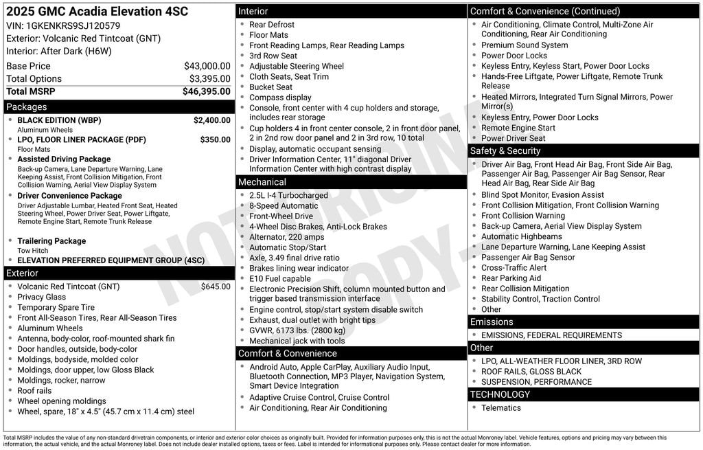 Volcanic Red Tintcoat 2025 GMC Acadia Elevation FWD 8-Speed Automatic 2.5L DOHC FWD, After Dark Cloth, 12 Speakers, 18 x 7.5 Aluminum Wheels, 1st & 2nd Row All-Weather Floor Liner (LPO), 2-Way Driver Power Lumbar Seat Adjuster, 3.49 Final Drive Axle Ratio, 3rd Row All-Weather Floor Liner (LPO), 3rd row seats: split-bench, 4-Way Manual Front Passenger Seat Adjuster, 4-Wheel Disc Brakes, 8-Passenger Seating (2-3-3 Seating Configuration), 8-Way Power Driver Seat Adjuster, ABS brakes, Air Conditioning, Alloy wheels, AM/FM radio: SiriusXM with 360L, Apple CarPlay/Android Auto, Auto High-beam Headlights, Auto-dimming Rear-View mirror, Automatic temperature control, Black Edition, Bodyside moldings, Bose Premium 12-Speaker System w/Sub-Woofer, Brake assist, Bumpers: body-color, Cloth Seat Trim, Compass, Delay-off headlights, Driver door bin, Driver vanity mirror, Dual front impact airbags, Dual front side impact airbags, Electronic Stability Control, Emergency communication system: OnStar Services capable, Exterior Parking Camera Rear, Floor Liner Package (LPO), Four wheel independent suspension, Front anti-roll bar, Front Bucket Seats, Front Center Armrest, Front dual zone A/C, Front fog lights, Front reading lights, Fully automatic headlights, Gloss Black Roof Rails, Heated door mirrors, Heated Driver & Front Passenger Seats, Heated front seats, Heated steering wheel, Illuminated entry, Leather steering wheel, Low tire pressure warning, Navigation System, Occupant sensing airbag, Outside temperature display, Overhead airbag, Overhead console, Panic alarm, Passenger door bin, Passenger vanity mirror, Performance Suspension, Power door mirrors, Power driver seat, Power Liftgate, Power steering, Power windows, Preferred Equipment Group 4SC, Radio data system, Radio: 15 Premium GMC Infotainment System, Rear air conditioning, Rear anti-roll bar, Rear reading lights, Rear seat center armrest, Rear side impact airbag, Rear window defroster, Rear window wiper, Remote keyless entry, Security system, SiriusXM w/360L, Speed control, Speed-sensing steering, Split folding rear seat, Spoiler, Sport steering wheel, Steering wheel mounted audio controls, Tachometer, Telescoping steering wheel, Tilt steering wheel, Traction control, Trip computer, Turn signal indicator mirrors, Variably intermittent wipers, Voltmeter, Wheels: 22 x 8.5 Gloss Black Aluminum, FWD, After Dark Cloth.