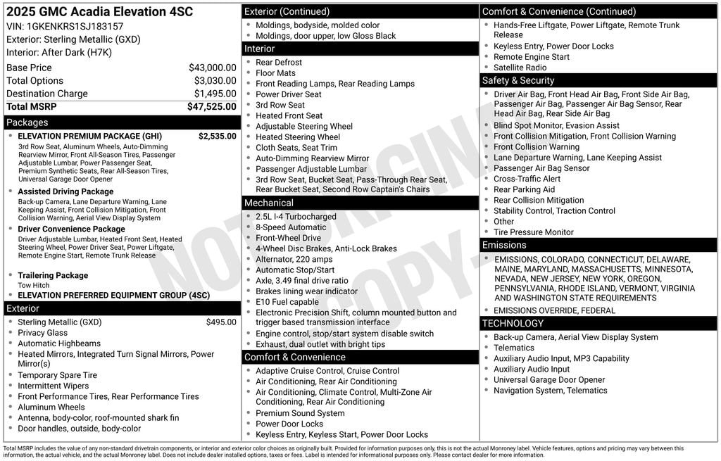Sterling Metallic 2025 GMC Acadia Elevation FWD 8-Speed Automatic 2.5L DOHC FWD, After Dark Cloth, 12 Speakers, 18 x 7.5 Aluminum Wheels, 2-Way Driver Power Lumbar Seat Adjuster, 3-Channel Programmable Universal Home Remote, 3.49 Final Drive Axle Ratio, 3rd row seats: split-bench, 4-Way Manual Front Passenger Seat Adjuster, 4-Wheel Disc Brakes, 6-Way Power Front Passenger Seat Adjuster, 7-Passenger Seating (2-2-3 Seating Configuration), 8-Passenger Seating (2-3-3 Seating Configuration), 8-Way Power Driver Seat Adjuster, ABS brakes, Air Conditioning, Alloy wheels, AM/FM radio: SiriusXM with 360L, Apple CarPlay/Android Auto, Auto High-beam Headlights, Auto-Dimming Inside Rear-View Mirror, Auto-dimming Rear-View mirror, Automatic temperature control, Bodyside moldings, Bose Premium 12-Speaker System w/Sub-Woofer, Brake assist, Bumpers: body-color, Cloth Seat Trim, Compass, CoreTec Seat Trim, Delay-off headlights, Driver door bin, Driver vanity mirror, Dual front impact airbags, Dual front side impact airbags, Electronic Stability Control, Elevation Premium Package, Emergency communication system: OnStar Services capable, Exterior Parking Camera Rear, Four wheel independent suspension, Front anti-roll bar, Front Bucket Seats, Front Center Armrest, Front dual zone A/C, Front fog lights, Front Passenger Power Lumbar Seat Adjuster, Front reading lights, Fully automatic headlights, Heated door mirrors, Heated Driver & Front Passenger Seats, Heated front seats, Heated steering wheel, Illuminated entry, Leather steering wheel, Low tire pressure warning, Navigation System, Occupant sensing airbag, Outside temperature display, Overhead airbag, Overhead console, Panic alarm, Passenger door bin, Passenger vanity mirror, Power door mirrors, Power driver seat, Power Liftgate, Power steering, Power windows, Preferred Equipment Group 4SC, Radio data system, Radio: 15 Premium GMC Infotainment System, Rear air conditioning, Rear anti-roll bar, Rear reading lights, Rear seat center armrest, Rear side impact airbag, Rear window defroster, Rear window wiper, Remote keyless entry, Security system, SiriusXM w/360L, Speed control, Speed-sensing steering, Split folding rear seat, Spoiler, Sport steering wheel, Steering wheel mounted audio controls, Tachometer, Telescoping steering wheel, Tilt steering wheel, Traction control, Trip computer, Turn signal indicator mirrors, Variably intermittent wipers, Voltmeter, Wheels: 20 x 8 Bright Silver Aluminum, FWD, After Dark Cloth.