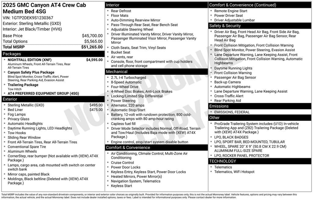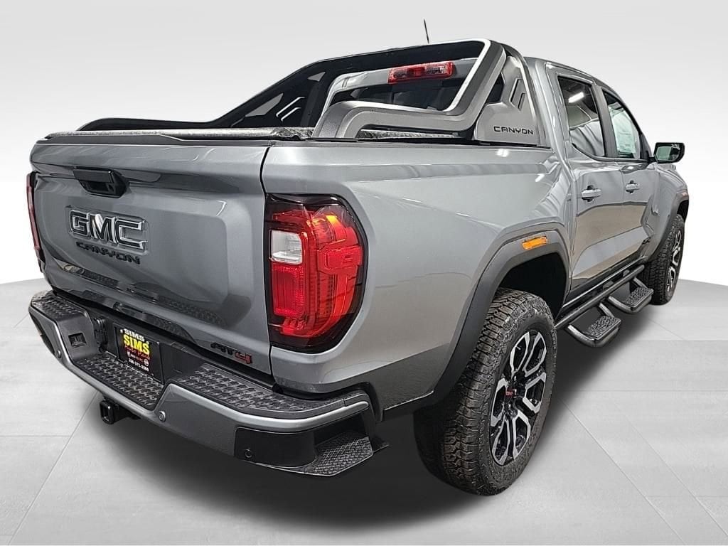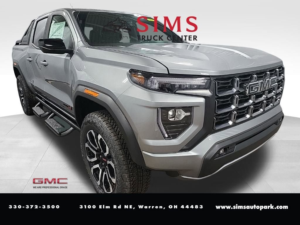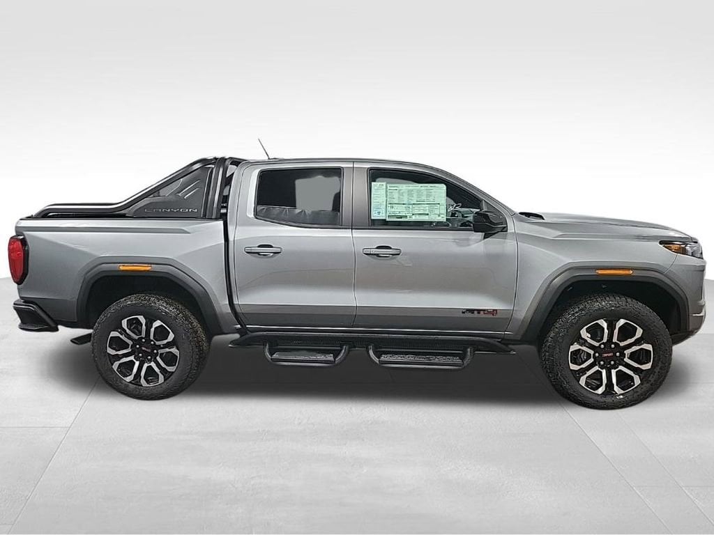 Sterling Metallic 2025 GMC Canyon AT4 4WD 8-Speed Automatic 2.7L I4 Turbocharged DOHC 16V LEV3-SULEV30 310hp 4WD, 120-Volt Bed Mounted Power Outlet, 2 1st Row USB Charge/Data Ports, 2 Rear USB Ports in Center Console (Charge-Only), 3.42 Rear Axle Ratio, 4-Way Manual Front Passenger Seat Adjuster, 4-Wheel Disc Brakes, 6 Speakers, 6-Speaker Audio System Feature, 8-Way Power Driver Seat Adjuster, ABS brakes, Air Conditioning, Alloy wheels, AM/FM radio, Apple CarPlay/Android Auto, Auto High-beam Headlights, Auto-dimming Rear-View mirror, Automatic Emergency Braking, Automatic Stop/Start, Automatic temperature control, Bed-Mounted Tubular Sport Bar (LPO), Black Badges (LPO), Blind Zone Steering Assist w/Trailering, Brake assist, Bumpers: body-color, Canyon Pro Safety, Canyon Safety Plus Package, Cloth/CoreTec Seat Trim, Compass, Delay-off headlights, Driver & Front Passenger Illuminated Visors, Driver door bin, Driver Mode Selector, Driver vanity mirror, Dual front impact airbags, Dual front side impact airbags, Dual-Zone Auto Climate Control Air Conditioning, Electronic Stability Control, Emergency communication system: OnStar, EZ-Lift & Lower Tailgate, Following Distance Indicator, Forward Collision Alert, Front anti-roll bar, Front Bucket Seats, Front Center Armrest, Front dual zone A/C, Front fog lights, Front LED Fog Lamps, Front Passenger Seatback Map Pocket, Front Pedestrian & Bicyclist Braking, Front reading lights, Front wheel independent suspension, Heated door mirrors, Heated Driver & Front Passenger Seats, Heated front seats, Illuminated entry, Inside Rear-View Auto-Dimming Mirror, Integrated Trailer Brake Controller, IntelliBeam Automatic High Beam On/Off, Interior Overhead Courtesy Light w/Dual Reading Lamp, Lane Keep Assist w/Lane Departure Warning, Low tire pressure warning, MultiStow Tailgate Storage Compartment, Navigation System, Nightfall Edition, Occupant sensing airbag, Off-Road Suspension, Outside temperature display, Overhead airbag, Overhead console, Panic alarm, Passenger door bin, Passenger vanity mirror, Power door mirrors, Power Driver Lumbar Control Seat Adjuster, Power driver seat, Power steering, Power windows, Preferred Equipment Group 4SG, Radio data system, Radio: 11.3 Diagonal Premium GMC Infotainment Sys, Rear Cross Traffic Braking, Rear of Console 120-Volt Power Outlet, Rear reading lights, Rear step bumper, Rear window defroster, Remote keyless entry, Remote Vehicle Starter System, Rocker Panel Protector (LPO), Security system, SiriusXM w/360L, Speed control, Speed-sensing steering, Split folding rear seat, Spray-On Bedliner w/GMC Logo, Steering wheel mounted audio controls, Stop/Start System Disable Button Engine Control, Tachometer, Tailgate Keyed Cylinder Lock, Telescoping steering wheel, Tilt & Telescopic Manual Steering Column, Tilt steering wheel, Traction control, Trip computer, Ultrasonic Rear Park Assist, Variably intermittent wipers, Wheels: 18 x 8.5 Dark Gray Machined Finish Alum, Wheels: 20 x 9 Machined Faced Aluminum, Wireless Apple CarPlay/Wireless Android Auto, 4WD.
