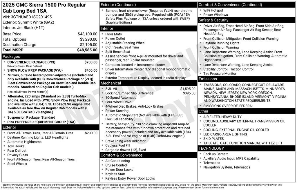 Summit White 2025 GMC Sierra 1500 Pro 4WD 10-Speed Automatic EcoTec3 5.3L V8 10-Speed Automatic, 4WD, Black Cloth, 2 Charge/Data USB Ports, 2 Speakers, 2-Speaker Audio System Feature, 220 Amp Alternator, 4-Way Manual Driver Seat Adjuster, 4-Way Manual Passenger Seat Adjuster, 4-Wheel Disc Brakes, ABS brakes, Air Conditioning, AM/FM radio, Apple CarPlay/Android Auto, Auto High-beam Headlights, Auto-Locking Rear Differential, Automatic Emergency Braking, Auxiliary External Transmission Oil Cooler, Brake assist, Buckle to Drive, Bumpers: chrome, Chrome Header w/Flat Black Grille Insert Bars, Compass, Convenience Package, Deep-Tinted Glass, Delay-off headlights, Driver door bin, Dual front impact airbags, Dual front side impact airbags, Electric Rear-Window Defogger, Electronic Stability Control, Emergency communication system: OnStar, External Engine Oil Cooling, EZ Lift Power Lock & Release Tailgate, Following Distance Indicator, Forward Collision Alert, Front 40/20/40 Split-Bench Seat, Front anti-roll bar, Front Center Armrest w/Storage, Front Frame-Mounted Black Recovery Hooks, Front Pedestrian Braking, Front reading lights, Front wheel independent suspension, Fully automatic headlights, HD Rear Vision Camera, Heated door mirrors, Heavy-Duty Air Filter, Illuminated entry, IntelliBeam Automatic High Beam On/Off, Lane Keep Assist w/Lane Departure Warning, LED Cargo Area Lighting, Low tire pressure warning, Occupant sensing airbag, OnStar Services Capable, Outside temperature display, Overhead airbag, Overhead console, Panic alarm, Passenger door bin, Passenger vanity mirror, Power Door Locks, Power door mirrors, Power Front Windows w/Driver Express Up/Down, Power Front Windows w/Passenger Express Down, Power steering, Power windows, Preferred Equipment Group 1SA, Push Button Start, Radio data system, Radio: GMC Infotainment Audio System, Rear reading lights, Rear step bumper, Remote Keyless Entry, Remote keyless entry, Snow Plow Prep Package, Solar Absorbing Tinted Glass, Speed control, Speed-sensing steering, Standard Suspension Package, Tachometer, Tilt steering wheel, Traction control, Trip computer, Variably intermittent wipers, Vinyl Seat Trim, Voltmeter, Wheels: 17 x 8 Silver Painted Steel, Wi-Fi Hotspot Capable, Wireless Apple CarPlay/Wireless Android Auto, 10-Speed Automatic, 4WD, Black Cloth.