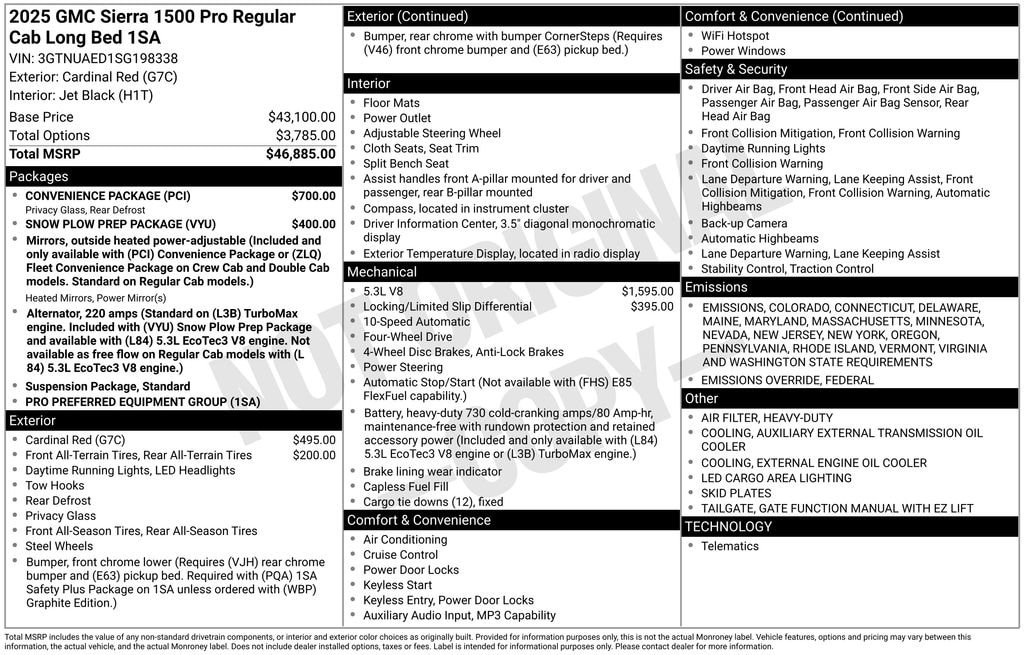 Cardinal Red 2025 GMC Sierra 1500 Pro 4WD 10-Speed Automatic EcoTec3 5.3L V8 10-Speed Automatic, 4WD, Black Cloth, 2 Charge/Data USB Ports, 2 Speakers, 2-Speaker Audio System Feature, 220 Amp Alternator, 3.23 Rear Axle Ratio, 3.42 Rear Axle Ratio, 4-Way Manual Driver Seat Adjuster, 4-Way Manual Passenger Seat Adjuster, 4-Wheel Disc Brakes, ABS brakes, Air Conditioning, AM/FM radio, Apple CarPlay/Android Auto, Auto High-beam Headlights, Auto-Locking Rear Differential, Automatic Emergency Braking, Auxiliary External Transmission Oil Cooler, Brake assist, Buckle to Drive, Bumpers: chrome, Chrome Header w/Flat Black Grille Insert Bars, Compass, Convenience Package, Deep-Tinted Glass, Delay-off headlights, Driver door bin, Dual front impact airbags, Dual front side impact airbags, Electric Rear-Window Defogger, Electronic Stability Control, Emergency communication system: OnStar, External Engine Oil Cooling, EZ Lift Power Lock & Release Tailgate, Following Distance Indicator, Forward Collision Alert, Front 40/20/40 Split-Bench Seat, Front anti-roll bar, Front Center Armrest w/Storage, Front Frame-Mounted Black Recovery Hooks, Front Pedestrian Braking, Front reading lights, Front wheel independent suspension, Fully automatic headlights, HD Rear Vision Camera, Heated door mirrors, Heavy-Duty Air Filter, Illuminated entry, IntelliBeam Automatic High Beam On/Off, Lane Keep Assist w/Lane Departure Warning, LED Cargo Area Lighting, Low tire pressure warning, Occupant sensing airbag, OnStar Services Capable, Outside temperature display, Overhead airbag, Overhead console, Panic alarm, Passenger door bin, Passenger vanity mirror, Power Door Locks, Power door mirrors, Power Front Windows w/Driver Express Up/Down, Power Front Windows w/Passenger Express Down, Power steering, Power windows, Preferred Equipment Group 1SA, Push Button Start, Radio data system, Radio: GMC Infotainment Audio System, Rear reading lights, Rear step bumper, Remote Keyless Entry, Remote keyless entry, Snow Plow Prep Package, Solar Absorbing Tinted Glass, Speed control, Speed-sensing steering, Standard Suspension Package, Tachometer, Tilt steering wheel, Traction control, Trip computer, Variably intermittent wipers, Vinyl Seat Trim, Voltmeter, Wheels: 17 x 8 Silver Painted Steel, Wi-Fi Hotspot Capable, Wireless Apple CarPlay/Wireless Android Auto, 10-Speed Automatic, 4WD, Black Cloth.