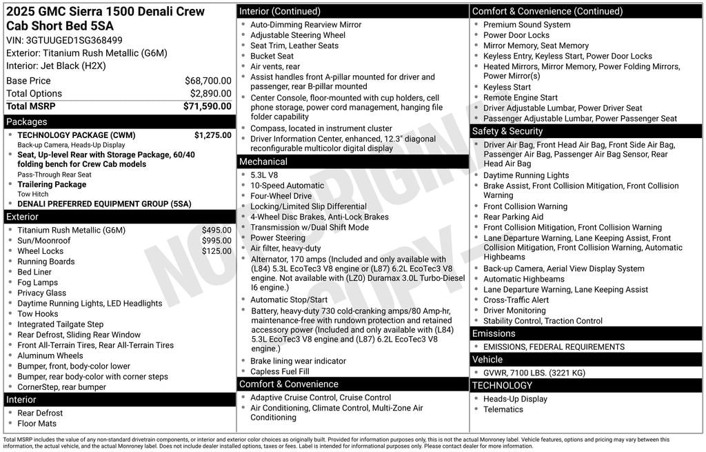 Titanium 2025 GMC Sierra 1500 Denali 4WD 10-Speed Automatic EcoTec3 5.3L V8 10-Speed Automatic, 4WD, Black Leather, 12-Way Power Driver Seat Adjuster w/Lumbar, 12-Way Power Passenger Seat Adjuster w/Lumbar, 120-Volt Bed Mounted Power Outlet, 120-Volt Interior Power Outlet, 170 Amp Alternator, 2 Charge/Data USB Ports Inside Center Console, 2 Type-C Charge-Only Rear USB Ports, 2 USB Ports, 3.23 Rear Axle Ratio, 4-Wheel Disc Brakes, 7 Speakers, ABS brakes, Adaptive suspension, Air Conditioning, Alloy wheels, AM/FM radio: SiriusXM with 360L, Apple CarPlay/Android Auto, Auto High-beam Headlights, Auto-dimming door mirrors, Auto-dimming Rear-View mirror, Auto-Locking Rear Differential, Automatic temperature control, Auxiliary External Transmission Oil Cooler, Bed View Camera, Brake assist, Buckle to Drive, Bumpers: body-color, Chrome Header w/Signature Denali Chrome Grille, Chrome Recovery Hooks, Chrome Wheel To Wheel Assist Steps, Color-Keyed Carpeting Floor Covering, Compass, Deep-Tinted Glass, Delay-off headlights, Denali Premium Suspension w/Adaptive Ride Control, Driver door bin, Driver Memory, Driver vanity mirror, Dual front impact airbags, Dual front side impact airbags, Electric Rear-Window Defogger, Electronic Stability Control, Emergency communication system: OnStar, Enhanced Automatic Emergency Braking, Floor-Mounted Center Console, Following Distance Indicator, Forge Perforated Leather Seat Trim, Forward Collision Alert, Front anti-roll bar, Front Bucket Seats, Front Center Armrest, Front dual zone A/C, Front fog lights, Front Pedestrian Braking, Front Rain-Sensing Wipers, Front reading lights, Front wheel independent suspension, Fully automatic headlights, Garage door transmitter, Genuine wood console insert, Genuine wood dashboard insert, Genuine wood door panel insert, HD Surround Vision, Heated 2nd Row Outboard Seats, Heated door mirrors, Heated Driver & Front Outboard Passenger Seating, Heated front seats, Heated rear seats, Heated steering wheel, Heavy-Duty Air Filter, Hill Descent Control, Hitch Guidance, Hitch View, Illuminated entry, In-Vehicle Trailering System App, Integrated Trailer Brake Controller, IntelliBeam Automatic High Beam On/Off, Keyless Open & Start, Lane Keep Assist w/Lane Departure Warning, LED Cargo Area Lighting, Low tire pressure warning, Memory seat, Multicolor 15 Diagonal Head-Up Display, Navigation System, Occupant sensing airbag, OnStar Services Capable, Outside temperature display, Overhead airbag, Overhead console, Panic alarm, Passenger door bin, Passenger vanity mirror, Perimeter Lighting, Power Door Locks, Power door mirrors, Power driver seat, Power Front Passenger Windows w/Express Up/Down, Power Front Windows w/Driver Express Up/Down, Power passenger seat, Power Rake & Telescoping Steering Column, Power Rear Windows w/Express Down, Power Sliding Rear Window w/Rear Defogger, Power steering, Power Sunroof, Power windows, Preferred Equipment Group 5SA, Premium Bose 7-Speaker Sound System, Push Button Start, Radio data system, Radio: Premium GMC Infotainment Audio System, Rain sensing wipers, Rear Camera Mirror, Rear Cross Traffic Braking, Rear Pedestrian Detection, Rear reading lights, Rear seat center armrest, Rear step bumper, Rear Wheelhouse Liners, Rear window defroster, Remote keyless entry, Remote Vehicle Starter System, Safety Alert Seat, Security system, SiriusXM w/360L Trial Subscription, Speed control, Speed-sensing steering, Split folding rear seat, Spray-On Pickup Bedliner w/GMC Logo, Steering Wheel Audio Controls, Steering wheel mounted audio controls, Tachometer, Technology Package, Telescoping steering wheel, Theft Deterrent System (Unauthorized Entry), Tilt steering wheel, Traction control, Trailer Camera Provisions, Trailer Side Blind Zone Alert, Trailering Package, Trip computer, Ultrasonic Front & Rear Park Assist, Universal Home Remote, Variably intermittent wipers, Price includes: $1500 - Bonus Cash. Exp. 11/03/20