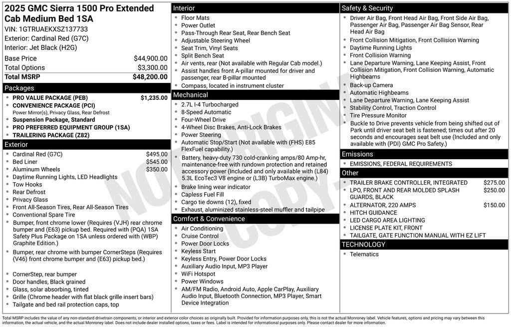 Cardinal Red 2025 GMC Sierra 1500 Pro 4WD 8-Speed Automatic 2.7L I4 Turbocharged DOHC 16V LEV3-SULEV30 310hp 8-Speed Automatic, 4WD, Jet Black Vinyl, 2 Charge/Data USB Ports, 220 Amp Alternator, 3.42 Rear Axle Ratio, 4-Way Manual Driver Seat Adjuster, 4-Way Manual Passenger Seat Adjuster, 4-Wheel Disc Brakes, 6 Speakers, 6-Speaker Audio System Feature, ABS brakes, Air Conditioning, AM/FM radio, Apple CarPlay/Android Auto, Auto High-beam Headlights, Automatic Emergency Braking, Brake assist, Buckle to Drive, Bumpers: chrome, Chrome Header w/Flat Black Grille Insert Bars, Compass, Convenience Package, Deep-Tinted Glass, Delay-off headlights, Driver door bin, Dual front impact airbags, Dual front side impact airbags, Electric Rear-Window Defogger, Electronic Stability Control, Emergency communication system: OnStar, EZ Lift Power Lock & Release Tailgate, Following Distance Indicator, Forward Collision Alert, Front & Rear Black Molded Splash Guards (LPO), Front 40/20/40 Split-Bench Seat, Front anti-roll bar, Front Center Armrest w/Storage, Front Frame-Mounted Black Recovery Hooks, Front License Plate Kit, Front Pedestrian Braking, Front reading lights, Front wheel independent suspension, Fully automatic headlights, HD Rear Vision Camera, Heated Power-Adjustable Outside Mirrors, Hitch Guidance, Illuminated entry, Integrated Trailer Brake Controller, IntelliBeam Automatic High Beam On/Off, Lane Keep Assist w/Lane Departure Warning, LED Cargo Area Lighting, Low tire pressure warning, Occupant sensing airbag, OnStar Services Capable, Outside temperature display, Overhead airbag, Overhead console, Panic alarm, Passenger door bin, Passenger vanity mirror, Power Door Locks, Power Front Windows w/Driver Express Up/Down, Power Front Windows w/Passenger Express Down, Power Rear Windows w/Express Down, Power steering, Power windows, Preferred Equipment Group 1SA, Pro Value Package, Push Button Start, Radio data system, Radio: GMC Infotainment Audio System, Rear reading lights, Rear step bumper, Remote Keyless Entry, Remote keyless entry, Solar Absorbing Tinted Glass, Speed control, Speed-sensing steering, Split folding rear seat, Spray-On Pickup Bedliner, Standard Suspension Package, Tachometer, Tilt steering wheel, Traction control, Trailering Package, Trip computer, Variably intermittent wipers, Vinyl Seat Trim, Voltmeter, Wheels: 17 x 8 Bright Silver Painted Aluminum, Wheels: 17 x 8 Silver Painted Steel, Wi-Fi Hotspot Capable, Wireless Apple CarPlay/Wireless Android Auto, 8-Speed Automatic, 4WD, Jet Black Vinyl.