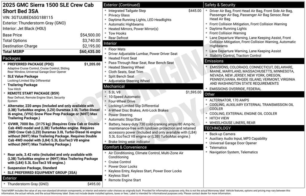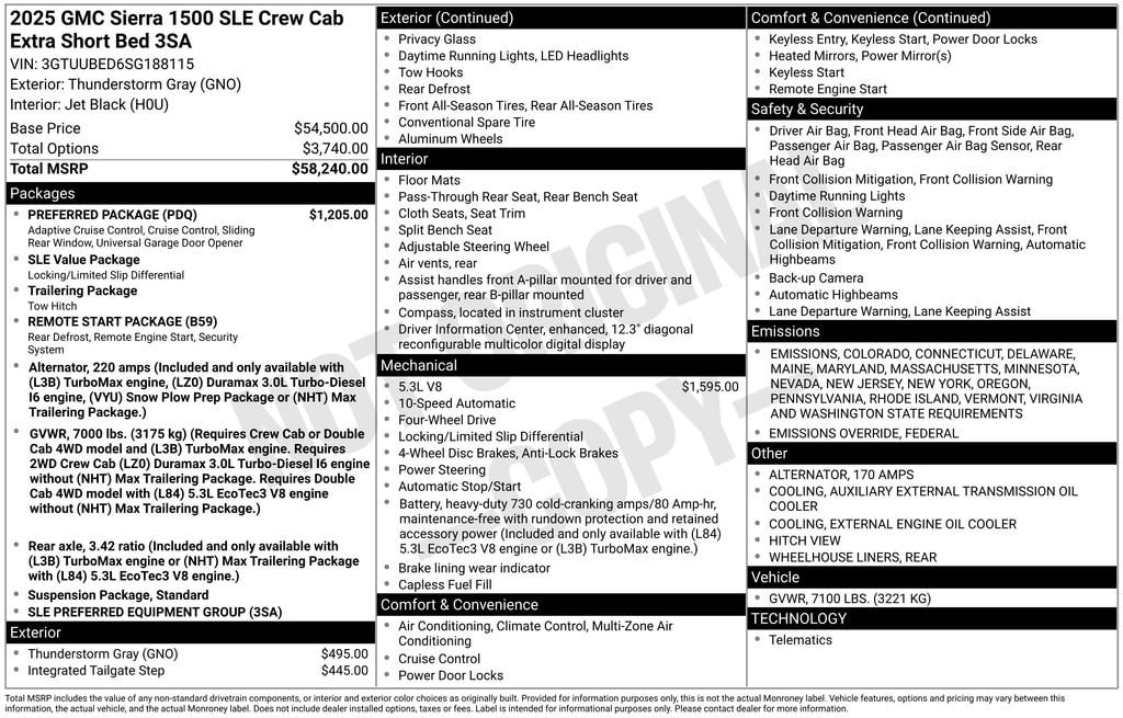 Thunderstorm Gray 2025 GMC Sierra 1500 SLE 4WD 10-Speed Automatic EcoTec3 5.3L V8 10-Speed Automatic, 4WD, Black Cloth, 10-Way Power Driver Seat Adjuster w/Lumbar, 120-Volt Bed Mounted Power Outlet, 120-Volt Interior Power Outlet, 170 Amp Alternator, 2 Charge/Data USB Ports, 2 Type-C Charge-Only Rear USB Ports, 220 Amp Alternator, 3.23 Rear Axle Ratio, 3.42 Rear Axle Ratio, 4-Way Manual Passenger Seat Adjuster, 4-Wheel Disc Brakes, 6 Speakers, 6-Speaker Audio System Feature, ABS brakes, Adaptive Cruise Control, Air Conditioning, Alloy wheels, AM/FM radio: SiriusXM with 360L, Apple CarPlay/Android Auto, Auto High-beam Headlights, Auto-Locking Rear Differential, Automatic Emergency Braking, Automatic temperature control, Auxiliary External Transmission Oil Cooler, Brake assist, Buckle to Drive, Bumpers: chrome, Chrome Header w/Medium Silver Grille Insert Bars, Cloth Seat Trim, Color-Keyed Carpeting Floor Covering, Compass, Deep-Tinted Glass, Delay-off headlights, Driver door bin, Driver vanity mirror, Dual front impact airbags, Dual front side impact airbags, Dual-Zone Automatic Climate Control, Electric Rear-Window Defogger, Electronic Stability Control, Emergency communication system: OnStar, External Engine Oil Cooling, Following Distance Indicator, Forward Collision Alert, Front 40/20/40 Split-Bench Seat, Front anti-roll bar, Front Center Armrest w/Storage, Front dual zone A/C, Front Frame-Mounted Black Recovery Hooks, Front Pedestrian Braking, Front reading lights, Front Rubberized-Vinyl Floor Mats, Front wheel independent suspension, Fully automatic headlights, GMC MultiPro Tailgate, HD Rear Vision Camera, Heated door mirrors, Heated Driver & Front Outboard Passenger Seating, Heated front seats, Heated steering wheel, Hitch Guidance, Hitch View, Illuminated entry, In-Vehicle Trailering System App, Integrated Trailer Brake Controller, IntelliBeam Automatic High Beam On/Off, Keyless Open & Start, Lane Keep Assist w/Lane Departure Warning, LED Cargo Area Lighting, Low tire pressure warning, Manual Tilt-Wheel & Telescoping Steering Column, Navigation System, Occupant sensing airbag, OnStar Services Capable, Outside temperature display, Overhead airbag, Overhead console, Panic alarm, Passenger door bin, Passenger vanity mirror, Power Door Locks, Power door mirrors, Power driver seat, Power Front Windows w/Driver Express Up/Down, Power Front Windows w/Passenger Express Down, Power Rear Windows w/Express Down, Power Sliding Rear Window w/Rear Defogger, Power steering, Power windows, Preferred Equipment Group 3SA, Preferred Package, Push Button Start, Radio data system, Radio: Premium GMC Infotainment Audio System, Rear reading lights, Rear Rubberized-Vinyl Floor Mats, Rear step bumper, Rear Wheelhouse Liners, Rear window defroster, Remote keyless entry, Remote Start Package, Remote Vehicle Starter System, Security system, SiriusXM w/360L Trial Subscription, SLE Convenience Package, SLE Value Package, Speed control, Speed-sensing steering, Split folding rear seat, Standard Suspension Package, Steering Wheel Audio Controls, Steering wheel mounted audio controls, Tachometer, Telescoping steering wheel, Theft Deterrent System (Unauthorized Entry), Tilt steering wheel, Traction control, Trailering Package, Trip computer, Universal Home Remote, Variably intermittent wipers, Voltmeter, Wheels: 17 x 8 Bright Silver Painted Aluminum, Wi-Fi Hotspot Capable, Wireless Apple CarPlay/Wireless Android Auto, 10-Speed Automatic, 4WD, Black Cloth.
