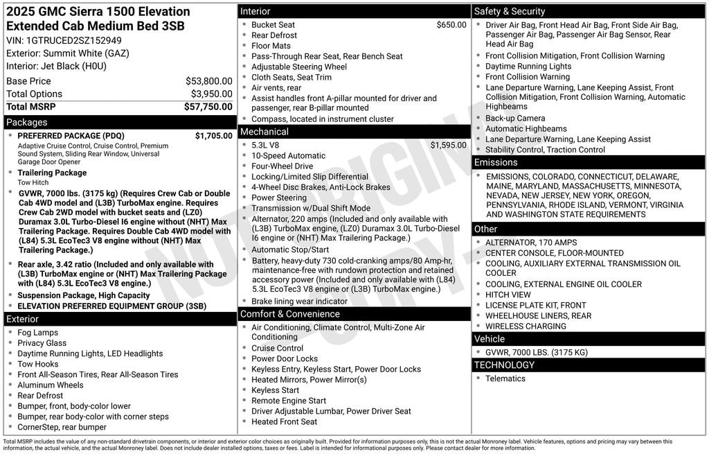 Summit White 2025 GMC Sierra 1500 Elevation 4WD 10-Speed Automatic EcoTec3 5.3L V8 10-Speed Automatic, 4WD, Black Cloth, 10-Way Power Driver Seat Adjuster w/Lumbar, 120-Volt Bed Mounted Power Outlet, 120-Volt Interior Power Outlet, 170 Amp Alternator, 2 Charge/Data USB Ports, 2 Charge/Data USB Ports Inside Center Console, 2 Type-C Charge-Only Rear USB Ports, 220 Amp Alternator, 3.23 Rear Axle Ratio, 3.42 Rear Axle Ratio, 4-Way Manual Passenger Seat Adjuster, 4-Wheel Disc Brakes, 6 Speakers, 6-Speaker Audio System Feature, ABS brakes, Adaptive Cruise Control, Air Conditioning, Alloy wheels, AM/FM radio: SiriusXM with 360L, Apple CarPlay/Android Auto, Auto High-beam Headlights, Auto-Locking Rear Differential, Automatic Emergency Braking, Automatic temperature control, Auxiliary External Transmission Oil Cooler, Body Color Header w/Gloss Black Mesh Grille Bars, Brake assist, Buckle to Drive, Bumpers: body-color, Cloth Seat Trim, Color-Keyed Carpeting Floor Covering, Compass, Deep-Tinted Glass, Delay-off headlights, Driver door bin, Driver vanity mirror, Dual front impact airbags, Dual front side impact airbags, Electric Rear-Window Defogger, Electronic Precision Shift, Electronic Stability Control, Emergency communication system: OnStar, External Engine Oil Cooling, Floor-Mounted Center Console, Following Distance Indicator, Forward Collision Alert, Front 40/20/40 Split-Bench Seat, Front anti-roll bar, Front Bucket Seats, Front Center Armrest w/Storage, Front dual zone A/C, Front fog lights, Front Frame-Mounted Black Recovery Hooks, Front License Plate Kit, Front Pedestrian Braking, Front reading lights, Front Rubberized-Vinyl Floor Mats, Front wheel independent suspension, Fully automatic headlights, Genuine wood dashboard insert, HD Rear Vision Camera, Heated door mirrors, Heated Driver & Front Outboard Passenger Seating, Heated front seats, Heated steering wheel, High Capacity Suspension Package, Hitch Guidance, Hitch View, Illuminated entry, In-Vehicle Trailering System App, Integrated Trailer Brake Controller, IntelliBeam Automatic High Beam On/Off, Keyless Open & Start, Lane Keep Assist w/Lane Departure Warning, LED Cargo Area Lighting, Low tire pressure warning, Manual Tilt-Wheel & Telescoping Steering Column, Navigation System, Occupant sensing airbag, OnStar Services Capable, Outside temperature display, Overhead airbag, Overhead console, Panic alarm, Passenger door bin, Passenger vanity mirror, Power Door Locks, Power door mirrors, Power driver seat, Power Front Windows w/Driver Express Up/Down, Power Front Windows w/Passenger Express Down, Power Rear Windows w/Express Down, Power Sliding Rear Window w/Rear Defogger, Power steering, Power windows, Preferred Equipment Group 3SB, Preferred Package, Premium Bose 7-Speaker Sound System, Push Button Start, Radio data system, Radio: Premium GMC Infotainment Audio System, Rear reading lights, Rear Rubberized-Vinyl Floor Mats, Rear step bumper, Rear Wheelhouse Liners, Rear window defroster, Remote keyless entry, Remote Vehicle Starter System, Security system, SiriusXM w/360L Trial Subscription, Speed control, Speed-sensing steering, Split folding rear seat, Steering Wheel Audio Controls, Steering wheel mounted audio controls, Tachometer, Telescoping steering wheel, Theft Deterrent System (Unauthorized Entry), Tilt steering wheel, Traction control, Trailering Package, Trip computer, Universal Home Remote, Variably intermittent wipers, Voltmeter, Wheels: 20 x 9 High Gloss Black Painted Aluminum, Wi-Fi Hotspot Capable, Wireless Apple CarPlay/Wireless Android Auto, Wireless Charging, 10-Speed Automatic, 4WD, Black Cloth.