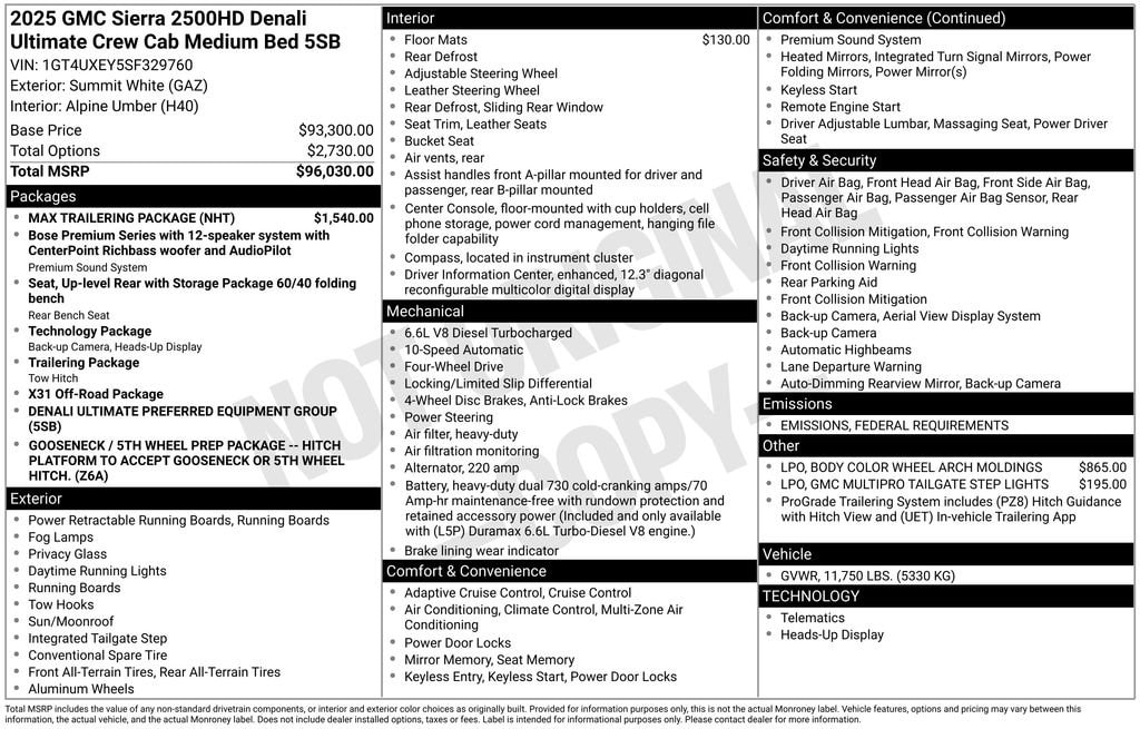 Summit White 2025 GMC Sierra 2500HD Denali Ultimate 4WD 10-Speed Automatic Duramax 6.6L V8 Turbodiesel 10-Speed Automatic, 4WD, Alpine Umber Leather, 12 Speakers, 120-Volt Bed Mounted Power Outlet, 120-Volt Instrument Panel Power Outlet, 16-Way Power Driver Seat Adjuster w/Lumbar, 16-Way Power Passenger Seat Adjuster w/Lumbar, 2 Charge-Only Rear USB Ports, 2 Charge/Data USB Ports Inside Center Console, 2 USB Ports, 2-Speed Active Transfer Case, 220-Amp Alternator, 3.42 Axle Ratio, 4-Wheel Disc Brakes, ABS brakes, Air Conditioning, Alloy wheels, AM/FM radio: SiriusXM with 360L, Apple CarPlay/Android Auto, Auto High-beam Headlights, Auto-dimming door mirrors, Auto-dimming Rear-View mirror, Automatic Emergency Braking, Automatic temperature control, Bed View Camera w/2 Trailer Camera Provisions, Block heater, Body Color Wheel Arch Moldings (LPO), Bose Premium Series 12-Speaker System, Brake assist, Buckle to Drive, Bumpers: body-color, Compass, Deep-Tinted Glass, Delay-off headlights, Driver door bin, Driver Memory, Driver vanity mirror, Dual front impact airbags, Dual front side impact airbags, Dual Heavy-Duty 70 Amp Battery, Electric Rear-Window Defogger, Electronic Stability Control, Emergency communication system: OnStar, Floor-Mounted Center Console, Following Distance Indicator, Forward Collision Alert, Front anti-roll bar, Front Bucket Seats, Front Center Armrest, Front dual zone A/C, Front fog lights, Front Pedestrian Braking, Front Prem Floor Liners w/Removable Carpet Insert, Front Rain-Sensing Wipers, Front reading lights, Front wheel independent suspension, Full Grain Leather Seat Trim, Fully automatic headlights, Garage door transmitter, Genuine wood dashboard insert, Genuine wood door panel insert, GMC MultiPro Tailgate Step Lights (LPO), Gooseneck/5th Wheel Prep Package, HD Surround Vision, Heads-Up Display, Heated 2nd Row Outboard Seats, Heated door mirrors, Heated Driver & Front Outboard Passenger Seats, Heated front seats, Heated rear seats, Heated steering wheel, Hill Descent Control, Hitch Guidance w/Hitch View, Illuminated entry, In-Vehicle Trailering System App, Inside Rearview Auto-Dimming Rear Camera Mirror, IntelliBeam Automatic High Beam On/Off, Keyless Open & Start, Lane Departure Warning System, Leather steering wheel, LED Cargo Area Lighting, LED Smoked Amber Roof Marker Lamps, Low tire pressure warning, Manual Tilt-Wheel/Telescoping Steering Column, Max Trailering Package, Memory seat, Multicolor 15 Diagonal Head-Up Display, Occupant sensing airbag, Off-Road Suspension, OnStar Services Capable, Outside temperature display, Overhead airbag, Overhead console, Panic alarm, Passenger door bin, Passenger vanity mirror, Pickup Box, Power door mirrors, Power driver seat, Power Front Passenger Windows w/Express Up/Down, Power moonroof, Power passenger seat, Power Sliding Rear Window w/Defogger, Power steering, Power Sunroof, Power windows, Preferred Equipment Group 5SB, Push Button Start, Radio: AM/FM w/Premium GMC Infotainment System, Rain sensing wipers, Rear Cross Traffic Alert, Rear Prem Floor Liners w/Removable Carpet Insert, Rear reading lights, Rear seat center armrest, Rear step bumper, Rear Wheelhouse Liners, Rear window defroster, Remote keyless entry, Remote Vehicle Starter System, Safety Alert Seat, Security system, Signature Denali Ultimate Grille in Vadar Chrome, SiriusXM w/360L Trial Subscription, Speed control, Speed-sensing steering, Split folding rear seat, Spray-On Pickup Bedliner w/GMC Logo, Steering Wheel Audio Controls, Steering wheel mounted audio controls, Tachometer, Technology Package, Telescoping steering wheel, Tilt steering wheel, Traction control, Trailer Cam Provisions & Trailer Viewing Software, Trailer Side Blind Zone Alert, Trailer Tire Pressure Monitor Sensors, Trip computer, Turn signal indicator mirrors, Ultrasonic Front & Rear Park Assist, Unauthorized Entry Theft-Deterrent System, Universal Home Remote, Vari Price include