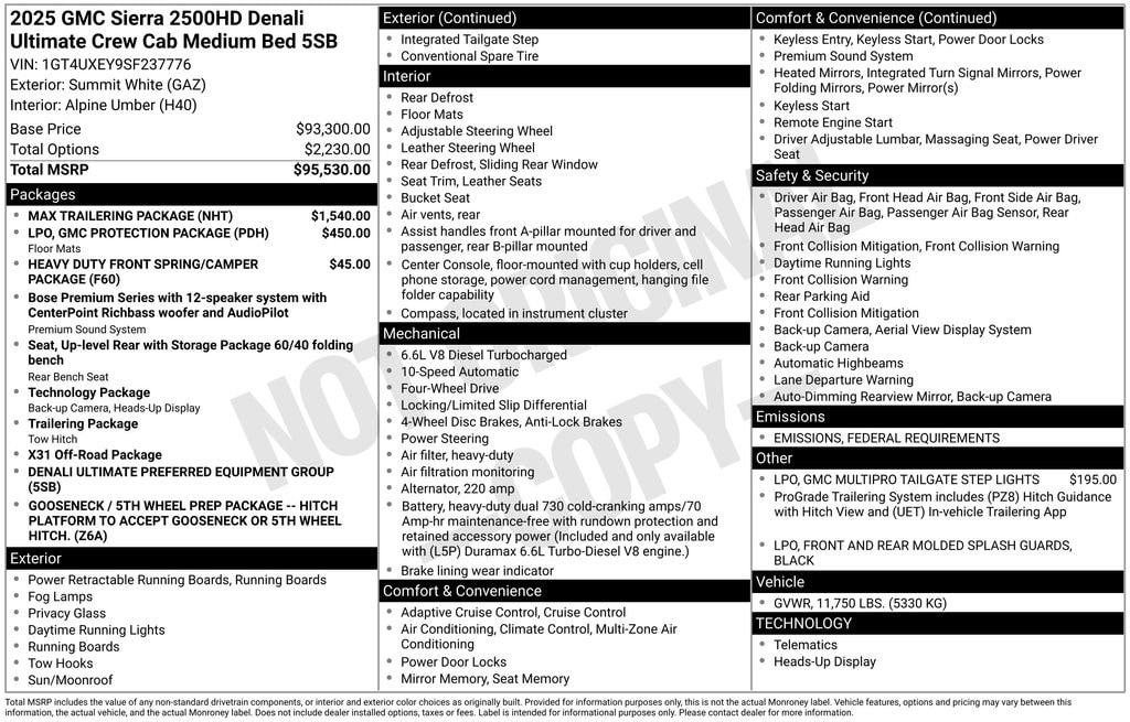 Summit White 2025 GMC Sierra 2500HD Denali Ultimate 4WD 10-Speed Automatic Duramax 6.6L V8 Turbodiesel 10-Speed Automatic, 4WD, Alpine Umber Leather, 12 Speakers, 120-Volt Bed Mounted Power Outlet, 120-Volt Instrument Panel Power Outlet, 16-Way Power Driver Seat Adjuster w/Lumbar, 16-Way Power Passenger Seat Adjuster w/Lumbar, 2 Charge-Only Rear USB Ports, 2 Charge/Data USB Ports Inside Center Console, 2 USB Ports, 2-Speed Active Transfer Case, 220-Amp Alternator, 3.42 Axle Ratio, 4-Wheel Disc Brakes, ABS brakes, Air Conditioning, All-Weather Floor Liners (LPO), Alloy wheels, AM/FM radio: SiriusXM with 360L, Apple CarPlay/Android Auto, Auto High-beam Headlights, Auto-dimming door mirrors, Auto-dimming Rear-View mirror, Automatic Emergency Braking, Automatic temperature control, Bed View Camera w/2 Trailer Camera Provisions, Black Front & Rear Molded Splash Guards (LPO), Block heater, Bose Premium Series 12-Speaker System, Brake assist, Buckle to Drive, Bumpers: body-color, Compass, Deep-Tinted Glass, Delay-off headlights, Driver door bin, Driver Memory, Driver vanity mirror, Dual front impact airbags, Dual front side impact airbags, Dual Heavy-Duty 70 Amp Battery, Electric Rear-Window Defogger, Electronic Stability Control, Emergency communication system: OnStar, Floor-Mounted Center Console, Following Distance Indicator, Forward Collision Alert, Front anti-roll bar, Front Bucket Seats, Front Center Armrest, Front dual zone A/C, Front fog lights, Front Pedestrian Braking, Front Rain-Sensing Wipers, Front reading lights, Front wheel independent suspension, Full Grain Leather Seat Trim, Fully automatic headlights, Garage door transmitter, Genuine wood dashboard insert, Genuine wood door panel insert, GMC MultiPro Tailgate Step Lights (LPO), GMC Protection Package (LPO), Gooseneck/5th Wheel Prep Package, HD Surround Vision, Heads-Up Display, Heated 2nd Row Outboard Seats, Heated door mirrors, Heated Driver & Front Outboard Passenger Seats, Heated front seats, Heated rear seats, Heated steering wheel, Heavy Duty Front Spring/Camper Package, Hill Descent Control, Hitch Guidance w/Hitch View, Illuminated entry, In-Vehicle Trailering System App, Inside Rearview Auto-Dimming Rear Camera Mirror, IntelliBeam Automatic High Beam On/Off, Keyless Open & Start, Lane Departure Warning System, Leather steering wheel, LED Cargo Area Lighting, LED Smoked Amber Roof Marker Lamps, Low tire pressure warning, Manual Tilt-Wheel/Telescoping Steering Column, Max Trailering Package, Memory seat, Multicolor 15 Diagonal Head-Up Display, Occupant sensing airbag, Off-Road Suspension, OnStar Services Capable, Outside temperature display, Overhead airbag, Overhead console, Panic alarm, Passenger door bin, Passenger vanity mirror, Pickup Box, Power door mirrors, Power driver seat, Power Front Passenger Windows w/Express Up/Down, Power moonroof, Power passenger seat, Power Sliding Rear Window w/Defogger, Power steering, Power Sunroof, Power windows, Preferred Equipment Group 5SB, Push Button Start, Radio: AM/FM w/Premium GMC Infotainment System, Rain sensing wipers, Rear Cross Traffic Alert, Rear reading lights, Rear seat center armrest, Rear step bumper, Rear Wheelhouse Liners, Rear window defroster, Remote keyless entry, Remote Vehicle Starter System, Safety Alert Seat, Security system, Signature Denali Ultimate Grille in Vadar Chrome, SiriusXM w/360L Trial Subscription, Speed control, Speed-sensing steering, Split folding rear seat, Spray-On Pickup Bedliner w/GMC Logo, Steering Wheel Audio Controls, Steering wheel mounted audio controls, Tachometer, Technology Package, Telescoping steering wheel, Tilt steering wheel, Traction control, Trailer Cam Provisions & Trailer Viewing Software, Trailer Side Blind Zone Alert, Trailer Tire Pressure Monitor Sensors, Trip computer, Turn signal indicator mirrors, Ultrasonic Front & Rear Park Assist, Unauthorized Entry Theft-Deterrent System, Universal Home Re Price include