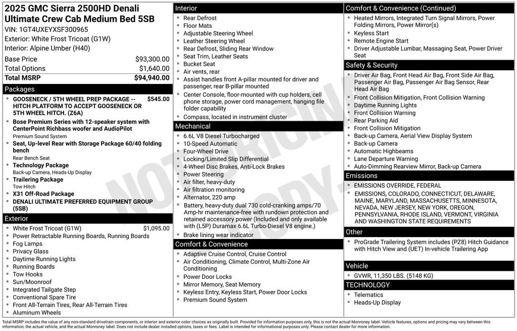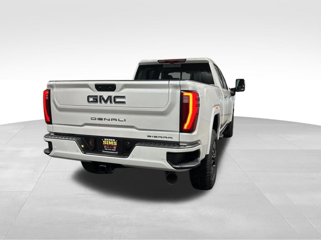 White Frost 2025 GMC Sierra 2500HD Denali Ultimate 4WD 10-Speed Automatic Duramax 6.6L V8 Turbodiesel 10-Speed Automatic, 4WD, Alpine Umber Leather, 12 Speakers, 120-Volt Bed Mounted Power Outlet, 120-Volt Instrument Panel Power Outlet, 16-Way Power Driver Seat Adjuster w/Lumbar, 16-Way Power Passenger Seat Adjuster w/Lumbar, 2 Charge-Only Rear USB Ports, 2 Charge/Data USB Ports Inside Center Console, 2 USB Ports, 2-Speed Active Transfer Case, 220-Amp Alternator, 3.42 Axle Ratio, 4-Wheel Disc Brakes, ABS brakes, Air Conditioning, Alloy wheels, AM/FM radio: SiriusXM with 360L, Apple CarPlay/Android Auto, Auto High-beam Headlights, Auto-dimming door mirrors, Auto-dimming Rear-View mirror, Automatic Emergency Braking, Automatic temperature control, Bed View Camera w/2 Trailer Camera Provisions, Block heater, Bose Premium Series 12-Speaker System, Brake assist, Buckle to Drive, Bumpers: body-color, Compass, Deep-Tinted Glass, Delay-off headlights, Driver door bin, Driver Memory, Driver vanity mirror, Dual front impact airbags, Dual front side impact airbags, Dual Heavy-Duty 70 Amp Battery, Electric Rear-Window Defogger, Electronic Stability Control, Emergency communication system: OnStar, Floor-Mounted Center Console, Following Distance Indicator, Forward Collision Alert, Front anti-roll bar, Front Bucket Seats, Front Center Armrest, Front dual zone A/C, Front fog lights, Front Pedestrian Braking, Front Rain-Sensing Wipers, Front reading lights, Front wheel independent suspension, Full Grain Leather Seat Trim, Fully automatic headlights, Garage door transmitter, Genuine wood dashboard insert, Genuine wood door panel insert, Gooseneck/5th Wheel Prep Package, HD Surround Vision, Heads-Up Display, Heated 2nd Row Outboard Seats, Heated door mirrors, Heated Driver & Front Outboard Passenger Seats, Heated front seats, Heated rear seats, Heated steering wheel, Hill Descent Control, Hitch Guidance w/Hitch View, Illuminated entry, In-Vehicle Trailering System App, Inside Rearview Auto-Dimming Rear Camera Mirror, IntelliBeam Automatic High Beam On/Off, Keyless Open & Start, Lane Departure Warning System, Leather steering wheel, LED Cargo Area Lighting, LED Smoked Amber Roof Marker Lamps, Low tire pressure warning, Manual Tilt-Wheel/Telescoping Steering Column, Memory seat, Multicolor 15 Diagonal Head-Up Display, Occupant sensing airbag, Off-Road Suspension, OnStar Services Capable, Outside temperature display, Overhead airbag, Overhead console, Panic alarm, Passenger door bin, Passenger vanity mirror, Pickup Box, Power door mirrors, Power driver seat, Power Front Passenger Windows w/Express Up/Down, Power moonroof, Power passenger seat, Power Sliding Rear Window w/Defogger, Power steering, Power Sunroof, Power windows, Preferred Equipment Group 5SB, Push Button Start, Radio: AM/FM w/Premium GMC Infotainment System, Rain sensing wipers, Rear Cross Traffic Alert, Rear reading lights, Rear seat center armrest, Rear step bumper, Rear Wheelhouse Liners, Rear window defroster, Remote keyless entry, Remote Vehicle Starter System, Safety Alert Seat, Security system, Signature Denali Ultimate Grille in Vadar Chrome, SiriusXM w/360L Trial Subscription, Speed control, Speed-sensing steering, Split folding rear seat, Spray-On Pickup Bedliner w/GMC Logo, Steering Wheel Audio Controls, Steering wheel mounted audio controls, Tachometer, Technology Package, Telescoping steering wheel, Tilt steering wheel, Traction control, Trailer Cam Provisions & Trailer Viewing Software, Trailer Side Blind Zone Alert, Trailer Tire Pressure Monitor Sensors, Trip computer, Turn signal indicator mirrors, Ultrasonic Front & Rear Park Assist, Unauthorized Entry Theft-Deterrent System, Universal Home Remote, Variably intermittent wipers, Ventilated Driver & Front Passenger Seats, Ventilated front seats, Voltmeter, Wheels: 20 Ultra-Bright Machined Aluminum, Wireless Charging, Wireless Phone Projection, X31 Off-Roa Price includes