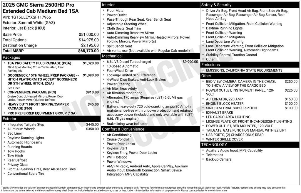 Summit White 2025 GMC Sierra 2500HD Pro 4WD 10-Speed Automatic Duramax 6.6L V8 Turbodiesel 10-Speed Automatic, 4WD, Black Cloth, 120-Volt Bed Mounted Power Outlet, 120-Volt Instrument Panel Power Outlet, 17 Machined Aluminum Wheels, 1SA Pro Safety Plus Package, 2 Charge-Only Rear USB Ports, 2 Charge/Data USB Ports, 2-Speed Electronic Shift Transfer Case, 220-Amp Alternator, 3.42 Axle Ratio, 3.73 Rear Axle Ratio, 4-Way Manual Driver Seat Adjuster, 4-Way Manual Passenger Seat Adjuster, 4-Wheel Disc Brakes, 6 Speakers, 6-Speaker Audio System Feature, ABS brakes, Air Conditioning, AM/FM radio, Apple CarPlay/Android Auto, Auto High-beam Headlights, Auto-Dimming Inside Rear-View Mirror, Automatic Emergency Braking, Bed View Camera, Brake assist, Buckle to Drive, Bumpers: chrome, Chrome Grille w/Flat Black Grille Insert Bars, Compass, Convenience Package, Deep-Tinted Glass, Delay-off headlights, Driver door bin, Dual front impact airbags, Dual front side impact airbags, Electric Rear-Window Defogger, Electronic Stability Control, Emergency communication system: OnStar, Engine Block Heater, Exhaust Brake, EZ Lift Power Lock & Release Tailgate, Following Distance Indicator, Forward Collision Alert, Front 40/20/40 Split-Bench Seats, Front anti-roll bar, Front Center Armrest w/Storage, Front License Plate Kit, Front Pedestrian Braking, Front reading lights, Front wheel independent suspension, Fully automatic headlights, GMC MultiPro Tailgate, Gooseneck/5th Wheel Prep Package, Heavy Duty Front Spring/Camper Package, Heavy-Duty 80 Amp Battery, Illuminated entry, Inside Rear-View Auto-Dimming Mirror, IntelliBeam Automatic High Beam On/Off, Lane Change Alert w/Side Blind Zone Alert, Lane Departure Warning System, LED Cargo Area Lighting, Low tire pressure warning, Occupant sensing airbag, OnStar Services Capable, Outside Power-Adjustable Black Mirrors, Outside temperature display, Overhead airbag, Overhead console, Panic alarm, Passenger door bin, Passenger vanity mirror, Perimeter Lighting, Pickup Box, Power steering, Power windows, Power-Adjustable Black Outside Mirrors, Preferred Equipment Group 1SA, Push Button Start, Radio: AM/FM w/GMC Infotainment System, Rear Cross Traffic Alert, Rear reading lights, Rear step bumper, Remote Keyless Entry, Remote keyless entry, SiriusXM Trial Subscription, Solar Absorbing Tinted Glass, Speed control, Split folding rear seat, Spray-On Pickup Bedliner, Suspension Package, Tachometer, Tilt steering wheel, Traction control, Trip computer, Ultrasonic Front & Rear Park Assist, Variably intermittent wipers, Vinyl Seat Trim, Voltmeter, Wheels: 17 Silver Painted Steel, Winter Grille Cover, Wireless Phone Projection, 10-Speed Automatic, 4WD, Black Cloth.