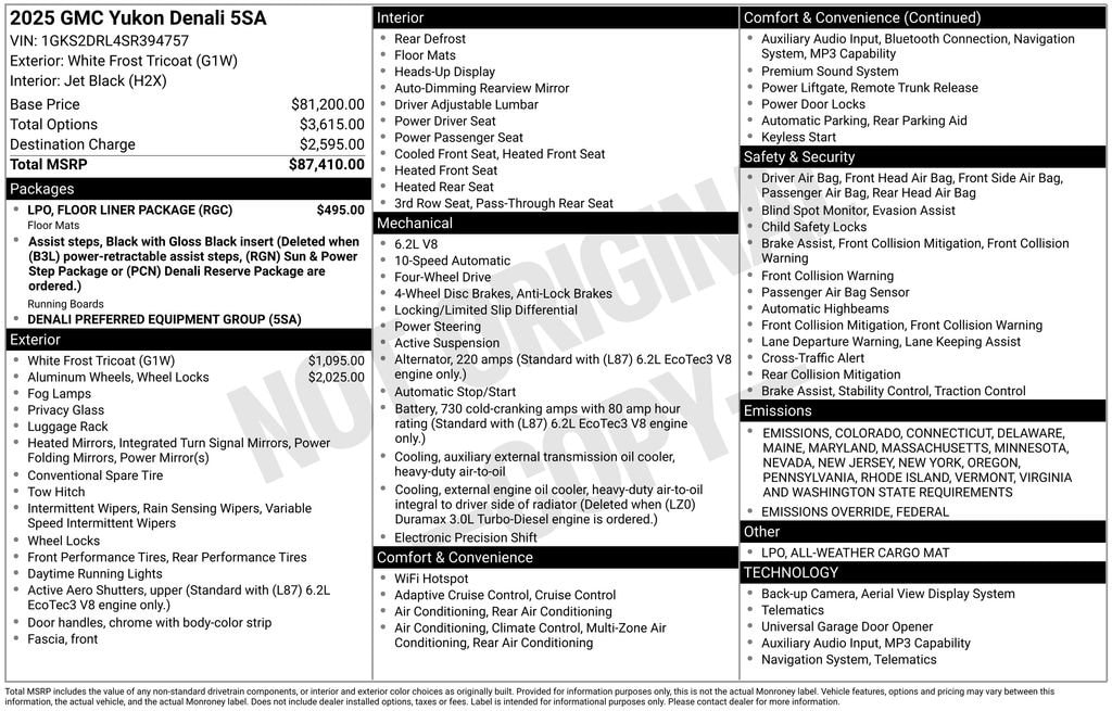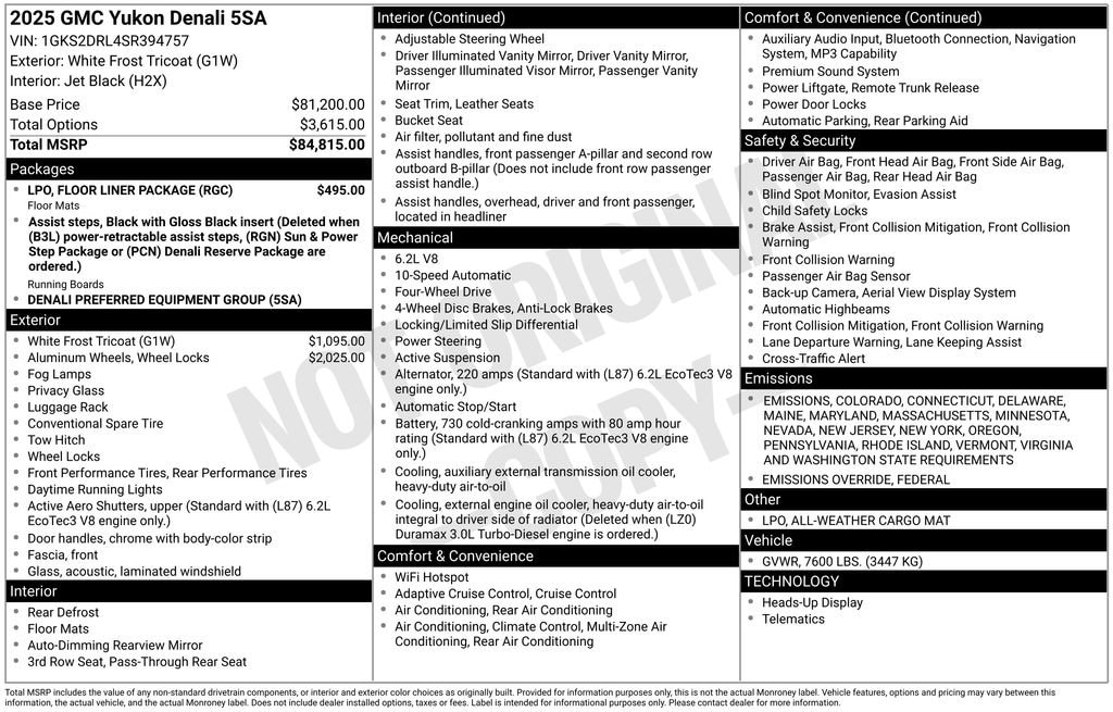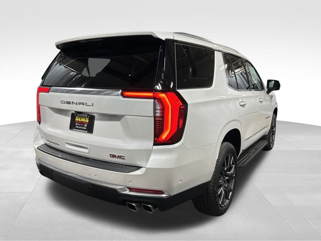 White Frost 2025 GMC Yukon Denali 4WD 10-Speed Automatic with Overdrive EcoTec3 6.2L V8 4WD, 10 Speakers, 15 Diagonal Multi-Color Head-Up Display, 1st & 2nd Rows Premium Floor Liners (LPO), 3.23 Rear Axle Ratio, 3rd Row All-Weather Floor Liners (LPO), 3rd row seats: split-bench, 4-Way Power Driver Lumbar Seat Adjuster, 4-Way Power Front Passenger Lumbar Seat Adjuster, 4-Wheel Disc Brakes, ABS brakes, Adaptive suspension, Air Conditioning, All-Weather Cargo Mat (LPO), Alloy wheels, AM/FM radio: SiriusXM with 360L, Apple CarPlay/Android Auto, Audio memory, Auto High-beam Headlights, Auto-dimming door mirrors, Auto-dimming Rear-View mirror, Auto-leveling suspension, Automatic temperature control, AutoSense Hands-Free Power Liftgate, Bodyside moldings, Bose 10-Speaker Surround w/CenterPoint, Brake assist, Bright Front & Rear Door Sill Plates, Bumpers: body-color, Compass, Delay-off headlights, Driver door bin, Driver vanity mirror, Dual Exhaust System, Dual front impact airbags, Dual front side impact airbags, Electronic Stability Control, Emergency communication system: OnStar and GMC connected services capable, Exterior Parking Camera Rear, Floor Liner Package (LPO), Four wheel independent suspension, Front anti-roll bar, Front Bucket Seats, Front Center Armrest, Front dual zone A/C, Front fog lights, Front reading lights, Fully automatic headlights, Galvano Bodyside Moldings, Garage door transmitter, Heads-Up Display, Heated door mirrors, Heated Driver & Front Passenger Seats, Heated front seats, Heated rear seats, Heated steering wheel, Illuminated entry, Low tire pressure warning, Magnetic Ride Control Suspension, Memory seat, Navigation system: GMC Connected Navigation, Occupant sensing airbag, Outside temperature display, Overhead airbag, Overhead console, Panic alarm, Passenger door bin, Passenger vanity mirror, Perforated Heated & Ventilated Dr & Frt Pass Seats, Perforated Leather Seating Surfaces, Power door mirrors, Power driver seat, Power Liftgate, Power passenger seat, Power Release 2nd Row Bucket Seats, Power steering, Power Tilt & Telescopic Steering Column, Power windows, Preferred Equipment Group 5SA, Radio: 16.8 Diagonal Premium GMC Infotainment Sys, Rain sensing wipers, Rear air conditioning, Rear anti-roll bar, Rear reading lights, Rear window defroster, Rear window wiper, Remote keyless entry, Security system, SiriusXM w/360L, Speed control, Speed-sensing steering, Split folding rear seat, Spoiler, Steering wheel memory, Steering wheel mounted audio controls, Tachometer, Telescoping steering wheel, Tilt steering wheel, Traction control, Trip computer, Turn signal indicator mirrors, Variably intermittent wipers, Ventilated front seats, Voltmeter, Wheel Locks (Set of 4) (LPO), Wheels: 20 x 9 6-Spoke Polished Aluminum, Wheels: 22 x 9 6-Spoke Carbon Flash Metallic Alum, 4WD.