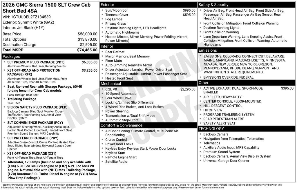 Summit White 2026 GMC Sierra 1500 SLT 4WD 10-Speed Automatic EcoTec3 6.2L V8 10-Speed Automatic, 4WD, Black Leather, 10-Way Power Driver Seat Adjuster w/Lumbar, 10-Way Power Passenger Seat Adjuster w/Lumbar, 120-Volt Bed Mounted Power Outlet, 120-Volt Interior Power Outlet, 170 Amp Alternator, 2 Charge/Data USB Ports, 2 Charge/Data USB Ports Inside Center Console, 2 Type-C Charge-Only Rear USB Ports, 20 Polished Aluminum Wheels, 3.23 Rear Axle Ratio, 4-Wheel Disc Brakes, 6 Speakers, 6-Speaker Audio System Feature, ABS brakes, Adaptive Cruise Control, Air Conditioning, All-Weather Floor Liner (LPO), Alloy wheels, AM/FM radio: SiriusXM with 360L, Apple CarPlay/Android Auto, Auto High-beam Headlights, Auto-dimming door mirrors, Auto-dimming Rear-View mirror, Auto-Locking Rear Differential, Automatic Emergency Braking, Automatic temperature control, Auxiliary External Transmission Oil Cooler, Brake assist, Buckle to Drive, Bumpers: chrome, Chrome Header & Chrome Grille Insert Bars, Chrome Wheel To Wheel Assist Steps, Color-Keyed Carpeting Floor Covering, Compass, Deep-Tinted Glass, Delay-off headlights, Driver door bin, Driver Memory, Driver vanity mirror, Dual Active Exhaust, Dual Exhaust System, Dual front impact airbags, Dual front side impact airbags, Electric Rear-Window Defogger, Electronic Precision Shift, Electronic Stability Control, Emergency communication system: OnStar, Floor-Mounted Center Console, Following Distance Indicator, Forward Collision Alert, Front 40/20/40 Split-Bench Seat, Front anti-roll bar, Front Bucket Seats, Front Center Armrest w/Storage, Front dual zone A/C, Front fog lights, Front Frame-Mounted Black Recovery Hooks, Front Pedestrian Braking, Front Rain-Sensing Wipers, Front reading lights, Front wheel independent suspension, Fully automatic headlights, HD Rear Vision Camera, HD Surround Vision, Heated 2nd Row Outboard Seats, Heated door mirrors, Heated Driver & Front Outboard Passenger Seating, Heated front seats, Heated steering wheel, Heavy-Duty Air Filter, High Capacity Suspension Package, Hill Descent Control, Hitch Guidance, Hitch View, Illuminated entry, In-Vehicle Trailering System App, Integrated Trailer Brake Controller, IntelliBeam Automatic High Beam On/Off, Keyless Open & Start, Lane Keep Assist w/Lane Departure Warning, LED Cargo Area Lighting, Low tire pressure warning, Manual Tilt-Wheel & Telescoping Steering Column, Memory seat, Navigation System, Occupant sensing airbag, Off-Road Suspension, OnStar Services Capable, Outside temperature display, Overhead airbag, Overhead console, Panic alarm, Passenger door bin, Passenger vanity mirror, Perf Leather-Appointed Front Outboard Seat Trim, Perimeter Lighting, Power Door Locks, Power door mirrors, Power driver seat, Power Front Passenger Windows w/Express Up/Down, Power Front Windows w/Driver Express Up/Down, Power passenger seat, Power Rake & Telescoping Steering Column, Power Rear Windows w/Express Down, Power Sliding Rear Window w/Rear Defogger, Power steering, Power Sunroof, Power windows, Preferred Equipment Group 4SA, Premium Bose 7-Speaker Sound System, ProGrade Trailering System, Push Button Start, Radio data system, Radio: Premium GMC Infotainment Audio System, Rain sensing wipers, Rear Cross Traffic Braking, Rear Pedestrian Detection, Rear reading lights, Rear seat center armrest, Rear step bumper, Rear Wheelhouse Liners, Rear window defroster, Remote keyless entry, Remote Vehicle Starter System, Safety Alert Seat, Security system, Sierra Safety Plus Package, SiriusXM w/360L Trial Subscription, SLT Convenience Package, SLT Preferred Package, SLT Premium Plus Package, Soft Folding Truck Bed Cover (LPO), Speed control, Speed-sensing steering, Split folding rear seat, Spray-On Pickup Bedliner w/GMC Logo, Standard Suspension Package, Steering Wheel Audio Controls, Steering wheel mounted audio controls, Tachometer, Telescoping steering Price includes: $1750 - Purchase Allowance. Exp.
