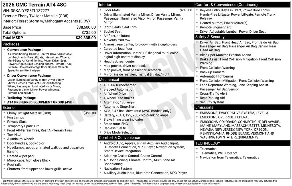 Ebony Twilight Metallic 2026 GMC Terrain AT4 AWD 8-Speed Automatic with Overdrive 1.5L DOHC AWD, 2-Way Power Driver Lumbar Seat Adjuster, 3.47 Final Drive Axle Ratio, 4-Wheel Disc Brakes, 6 Speakers, 6-Speaker Audio System Feature, 8-Way Power Driver Seat Adjuster, ABS brakes, Air Conditioning, Alloy wheels, AM/FM radio: SiriusXM, Auto High-beam Headlights, Automatic temperature control, Brake assist, Bumpers: body-color, Cloth/Core Tec Seat Trim, Compass, Delay-off headlights, Driver & Front Passenger Heated Seats, Driver door bin, Driver vanity mirror, Dual front impact airbags, Dual front side impact airbags, Electronic Stability Control, Emergency communication system: OnStar and GMC connected services capable, Four wheel independent suspension, Front All-Weather Floor Mats (LPO), Front anti-roll bar, Front Bucket Seats, Front Center Armrest, Front dual zone A/C, Front fog lights, Front Passenger 4-Way Manual Seat Adjuster, Front reading lights, Fully automatic headlights, Garage door transmitter, Heated door mirrors, Heated front seats, Heated steering wheel, Illuminated entry, Low tire pressure warning, Navigation System, Occupant sensing airbag, Outside temperature display, Overhead airbag, Overhead console, Panic alarm, Passenger door bin, Passenger vanity mirror, Power door mirrors, Power driver seat, Power Liftgate, Power steering, Power windows, Preferred Equipment Group 4SB, Radio data system, Radio: Premium GMC Infotainment System, Rain sensing wipers, Rear air conditioning, Rear anti-roll bar, Rear seat center armrest, Rear window defroster, Rear window wiper, Remote keyless entry, Second Row All-Weather Mat (LPO), Security system, Speed control, Speed-sensing steering, Split folding rear seat, Spoiler, Sport steering wheel, Steering wheel mounted audio controls, Tachometer, Telescoping steering wheel, Tilt steering wheel, Traction control, Trip computer, Variably intermittent wipers, Wheels: 17 Dark Machined Aluminum, Wireless Apple CarPlay/Wireless Android Auto, AWD.